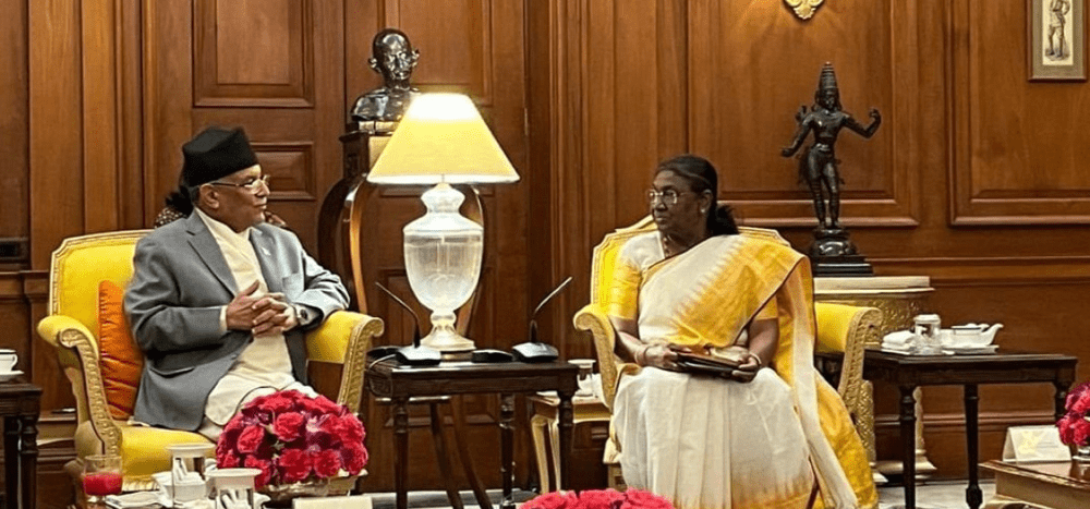 काठमाडौँ । भारतको औपचारिक भ्रमणमा रहेका प्रधानमन्त्री पुष्पकमल दाहालले राष्ट्रपति द्रौपदी मुर्मुसँग शिष्टाचार भेट गरेका छन् । नयाँ दिल्लीस्थित राष्ट्रपति भवनमा सोमबार प्रधानमन्त्री दाहालले राष्ट्रपति मुर्मुसँग भेट गरेका हुन् ।