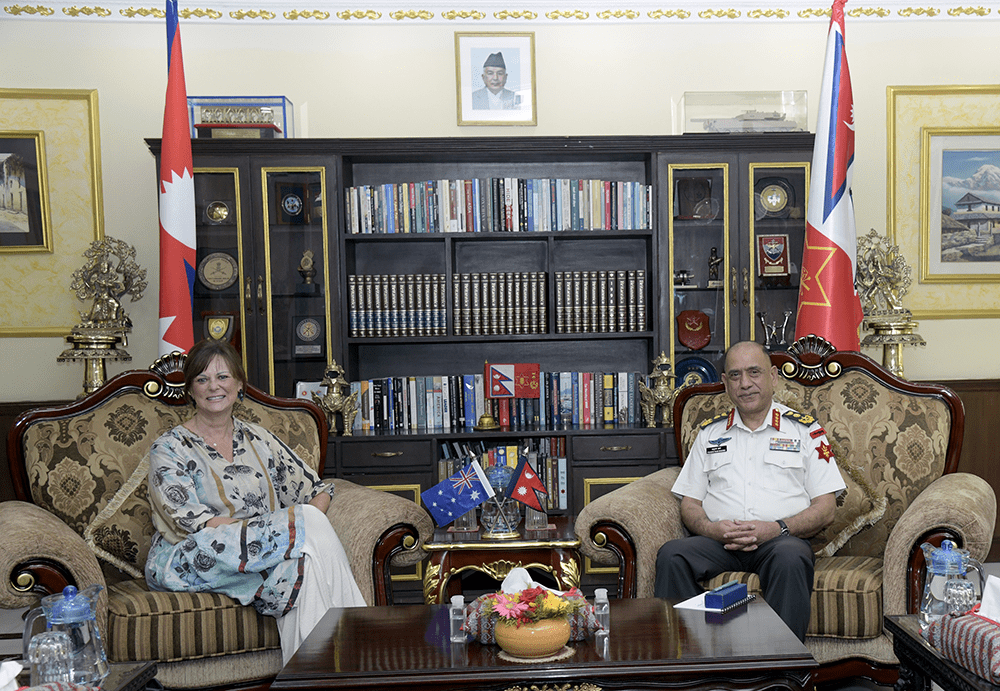 काठमाडौँ । प्रधानसेनापति प्रभुराम शर्मा र नेपालका लागि अष्ट्रेलियाका महामहिम राजदूत फेलिसिटी भोल्कबीच जङ्गी अड्डामा शिष्टाचार भेट भएको छ ।प्रधान सेनापतिको कार्यकक्षमा भएको उक्त भेटघाटमा दुई पक्षीय हित तथा पारस्परिक सम्बन्धका विषयमा छलफल भएको थियो । यस किसिमको भेटघाटले दुई देश बिच रहि आएको सम्बन्ध थप सुमधुर एवं प्रगाढ बनाउन मद्दत पुग्ने विश्वास नेपाली सेनाले लिएको छ ।