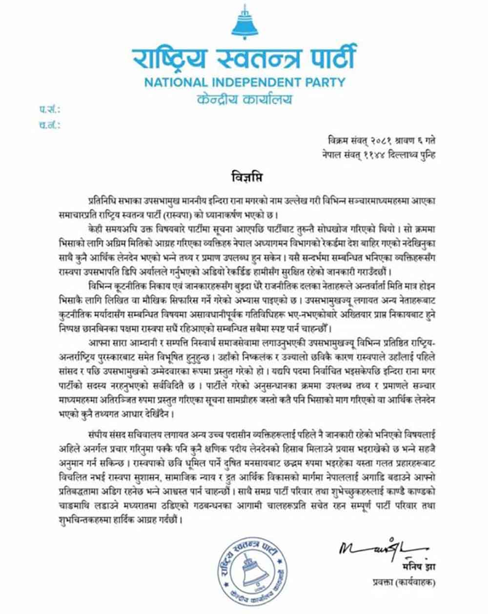 काठमाडौं । राष्ट्रिय स्वतन्त्र पार्टी (रास्वपा) ले प्रतिनिधिसभाकी उपसभामुख इन्दिरा रानामगरले अमेरिकी भिसाका लागि आर्थिक लेनदेन गरेको नपाइएको बताएको छ ।पार्टीका कार्यबाहक प्रवक्ता मनीष झाले आइतबार एक विज्ञप्ति जारी गर्दै अनुसन्धानका क्रममा उपलब्ध तथ्य र प्रमाणले भिसाको माग गरिएको वा आर्थिक लेनदेन भएको कुनै तथ्यगत आधार नभेटिएको दाबी गरेका हुन् ।