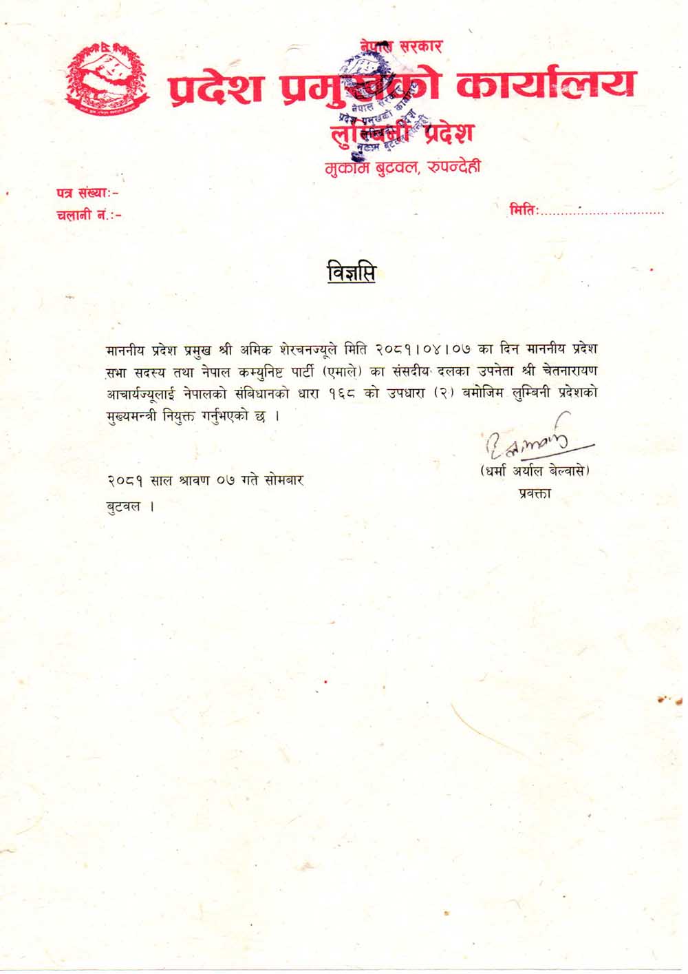 काठमाडौँ । लुम्बिनी प्रदेशको मुख्यमन्त्रीमा चेतनारायण आचार्य नियुक्त भएका छन् । प्रदेश प्रमुख अमिक शेरचनले संबिधानको धारा १६८ को उपधारा २ अनुसार आचार्यलाई मुख्यमन्त्रीमा नियुक्त गरेको प्रदेश प्रमुखको कार्यलयले जानकारी दिएको हो । यसअघि एमाले संसदीय दलका उपनेता रहेका आचार्यले आजै कांग्रेसको समर्थनमा सरकार बनाउने दाबि पेश गरेका थिए ।