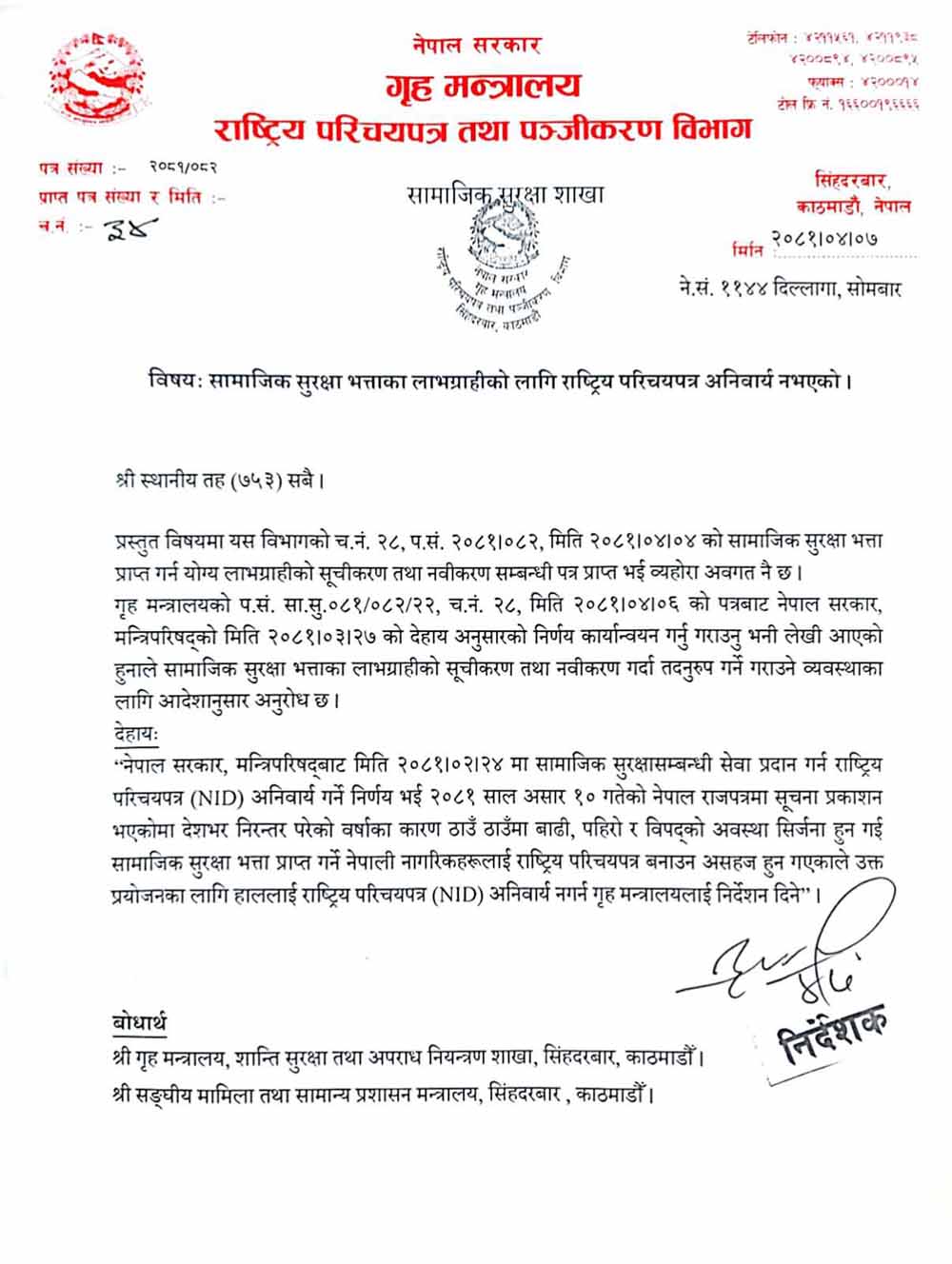 विभागले देशभर निरन्तर परेको वर्षाका कारण ठाँउठाँउमा बाढी, पहिरो र विपद्को अवस्था सिर्जना हुन गई सामाजिक सुरक्षा भत्ता प्राप्त गर्ने नागरिकहरूलाई राष्ट्रिय परिचयपत्र बनाउन असहज हुन गएकाले उक्त प्रयोजनका लागि हाललाई राष्ट्रिय परिचयपत्र अनिवार्य नगर्न गृह मन्त्रालयलाई निर्देशन दिने मन्त्रिपरिषदले गरेको निर्णयका आधारमा सामाजिक सुरक्षा भत्ताका लागि राष्ट्रिय परिचय पत्र अनिवार्य नभएको र सोहि अनुसार कार्यान्वयन गराउन निर्देशन दिएको जनाएको छ ।