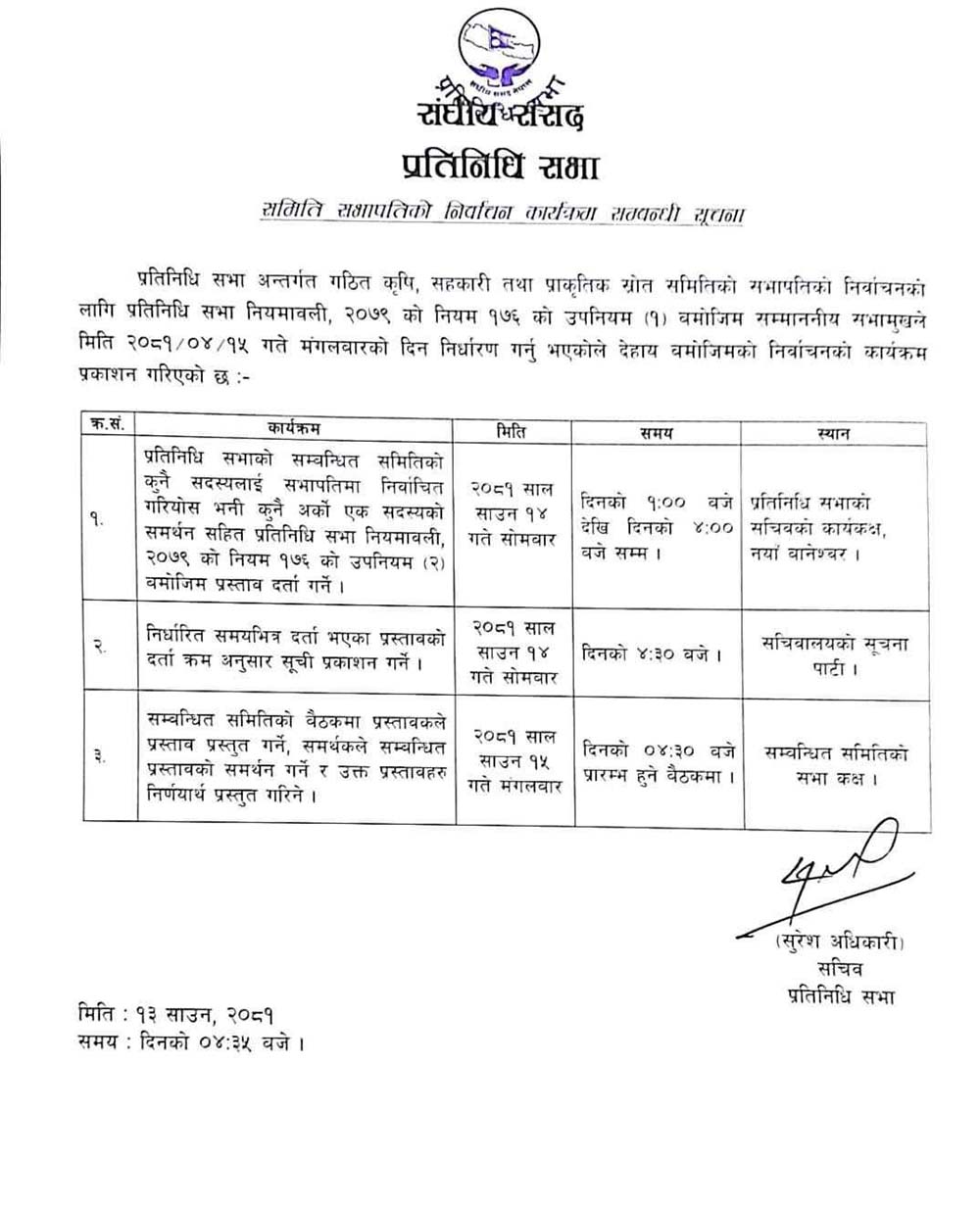 काठमाडौँ । प्रतिनिधि सभाको कृषि, सहकारी तथा प्राकृतिक स्रोत समितिको सभापतिको निर्वाचन मंगलबार हुने भएको छ ।सभामुख देवराज घिमिरेले समितिको सभापतिको मनोनयन सोमबार हुने र निर्वाचन मंगलबार हुने गरी तोकेका हुन् ।यस अघि समितिको सभापति रहेकी कांग्रेस नेतृ डा. आरजु राणा देउवा परराष्ट्रमन्त्री बनेपछि सभापति पद खालि रहेको थियो ।