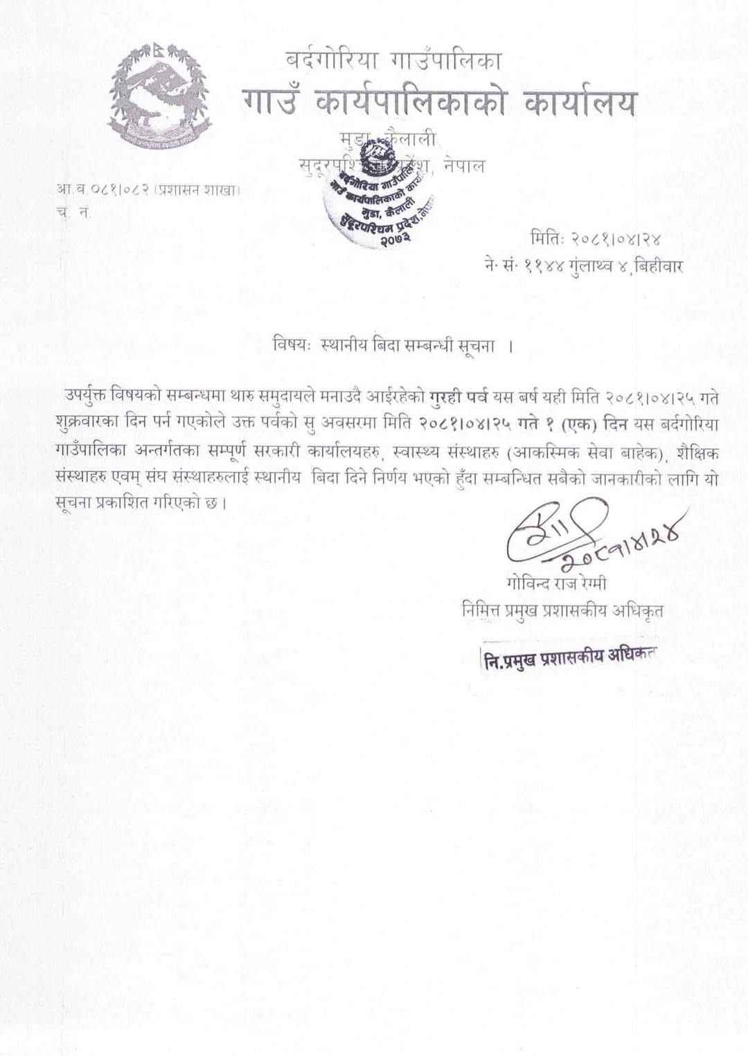 कैलाली । थारु समुदायको गुरही पर्वको अवसरमा कैलालीका विभिन्न स्थानीय तहले भोलि सार्वजनिक बिदा दिएका छन् । थारू समुदायको पहिलो पर्वको रूपमा मनाइने गुरही पर्वको अवसरमा बर्दगोरिया गाउँपालिकाले सार्वजनिक बिदा दिएको हो । गुरही पर्व यो वर्ष श्रावण २५ गते शुक्रबारको दिन परेको छ। पश्चिमवासी थारू समुदायले हरेक वर्ष नागपञ्चमीको दिन मनाउँदै आएका छन्।