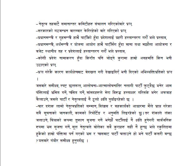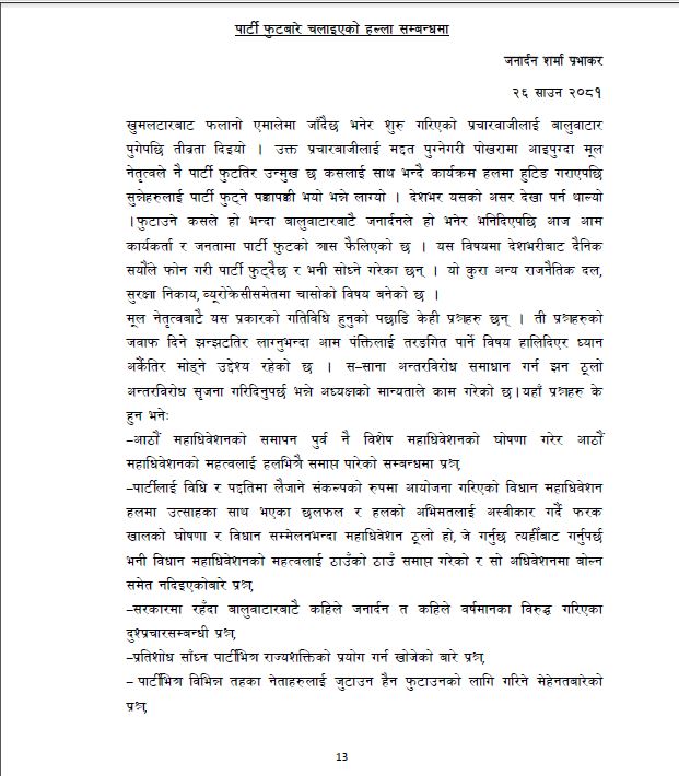 ‘खुमलटारबाट फलानो एमालेमा जाँदैछ भनेर सुरु गरिएको प्रचारबाजीलाई बालुवाटार पुगे पचि तिब्रता दिइयो, उक्त प्रचारबाजीलाई मधत पुग्ने गरी पोखरामा पुक्ष्दा मुल नेतृत्वले नै पार्टी फुटतिर उन्मुख छ कसलाई साथ भन्दै कार्यक्रम हलमा हुटिङ गराए पछि सुन्नेहरुलाई पार्टी फुटने पक्कापक्की भयो भन्ने लाग्यो, देशभर यसको असर देखा पर्न थाल्यो,’ शर्माले पेस गरेको राजनतीतिक प्रस्तावमा उल्लेख गरेका छन, ‘फुटाउने कसले हो भनेर भनिदिए पछि आज आम कार्यकर्ता र जनतामा पार्टी फुटदैँछ र भन्ने सोध्ने गरेका छन ।’उनका अनुसार माओवादी बिभाजन अन्य राजनीतिक दल, सुरक्षा निकाय र ब्युरोक्रेसीसमेतमा चासोको बिषय बन्न पुगेको छ ।