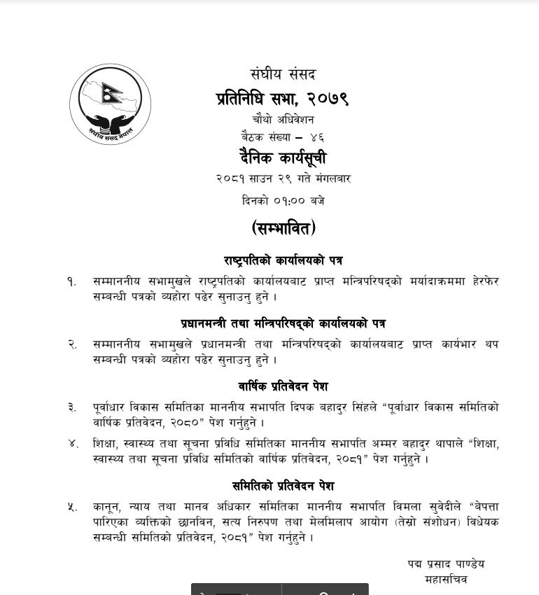 काठमाडौं प्रतिनिधिसभाको बैठक बस्दैँछ ।संघीय संसद भवन, नयाँ बानेश्वरमा उक्त बैठक बस्नेछ । बैठक दिउँसो १ बजे बस्नेछ ।आजको बैठकमा सभामुख देवराज घिमिरेले राष्ट्रपति कार्यालयवाट प्राप्त मन्त्रिपरिषदको मर्यादाक्रम हेरफेर सबन्धी पत्र र प्रधानमन्त्री तथा मन्त्रिपरिषदको कार्यालयवाट प्राप्त कार्यभार थप सबन्धी पत्रको ब्योहोरा पढेर सुनाउने छन ।