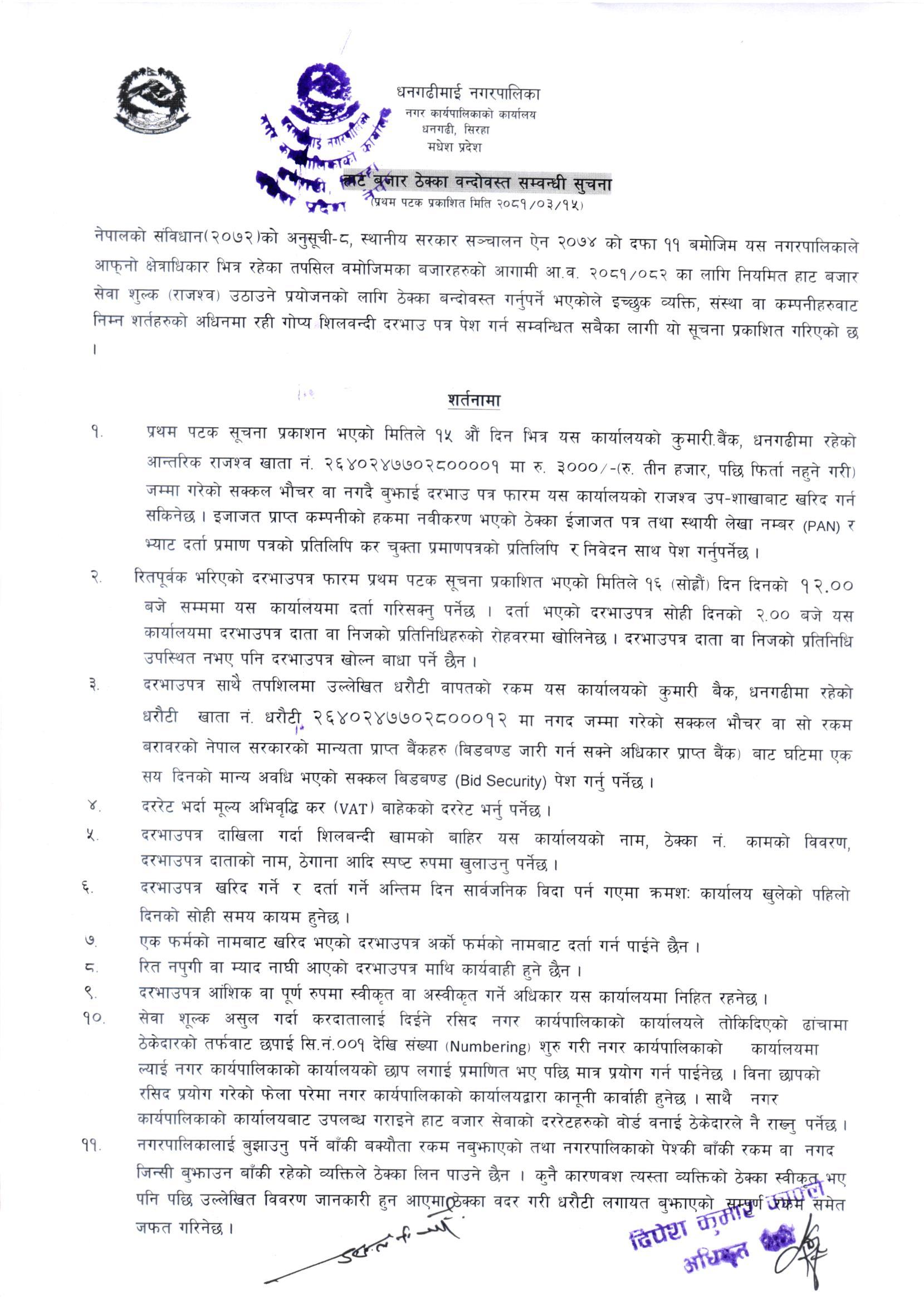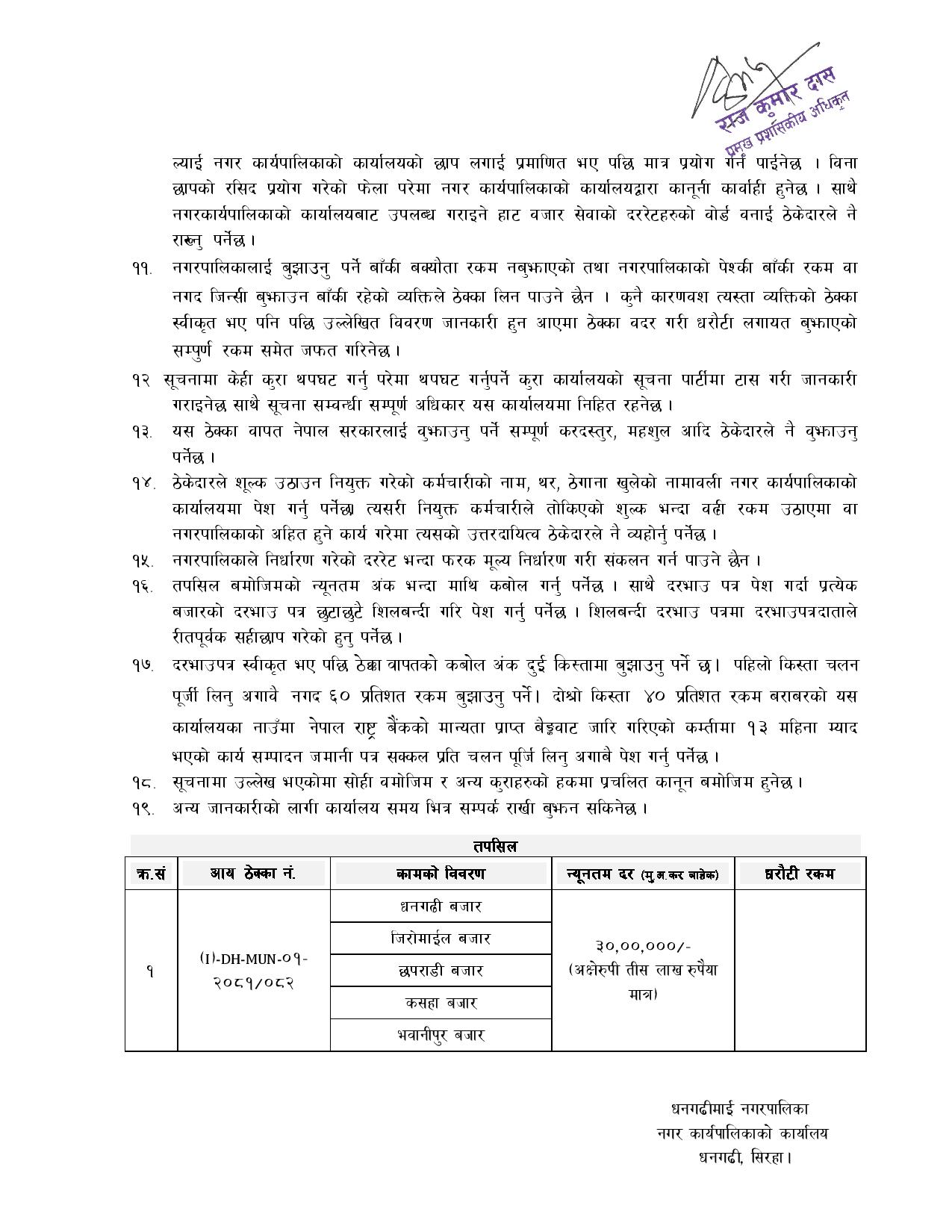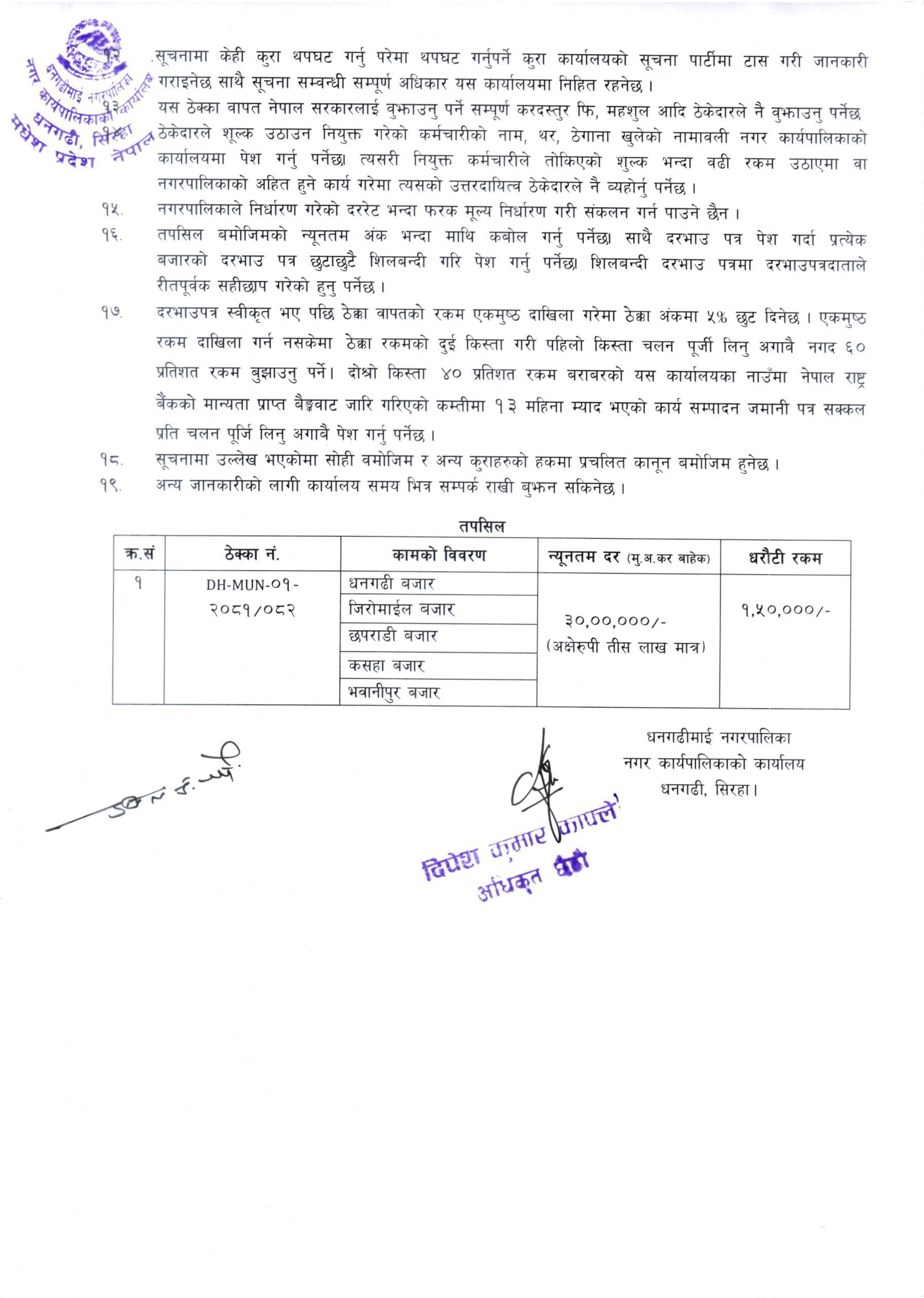 नगरपालिकाले असार १५ गते हाट बजार ठेक्का बन्दोवस्त सम्वन्धी १५ दिने सूचना प्रकाशन गरेको छ । प्रथम पटक प्रकाशित सूचनामा धनगढी, जिरोमाईल र छपराडी बजारको न्यूनतम दर १९ लाख ७५ हजार रुपैयाँ तथा कसहा र भवानीपुर बजारको तीन लाख रुपैयाँ को सूचना प्रकाशन गर्यो । यस सूचना अवधिमा बजार ठेक्का नलागेपछि दोस्रो पटक प्रकाशित भएको सूचना पालिकाको वेवसाइटमा देखिन्न तर, २०८१ साउन ८ गते पुनः तेस्रो पटक सूचना प्रकाशन भयो। यो सूचनामा भने पाँचवटै बजारको न्यूनतम दर एकमुस्ट ३० लाख रुपैयाँ उल्लेख भएको छ ।