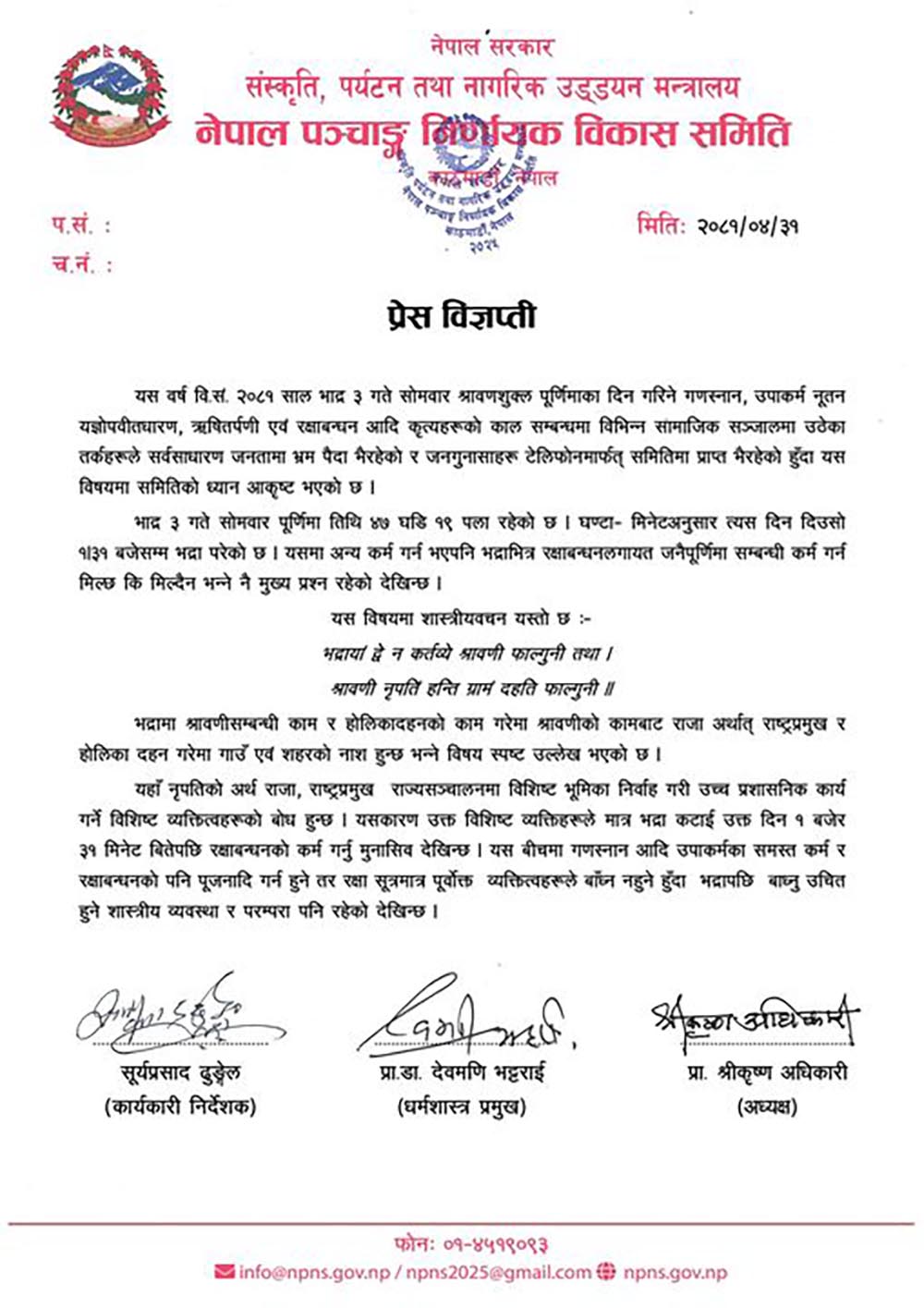 आज भद्रा परेको विषयमा पञ्चाङ्ग निर्णायक समितिले रक्षाबन्धन बारे के भन्यो ?