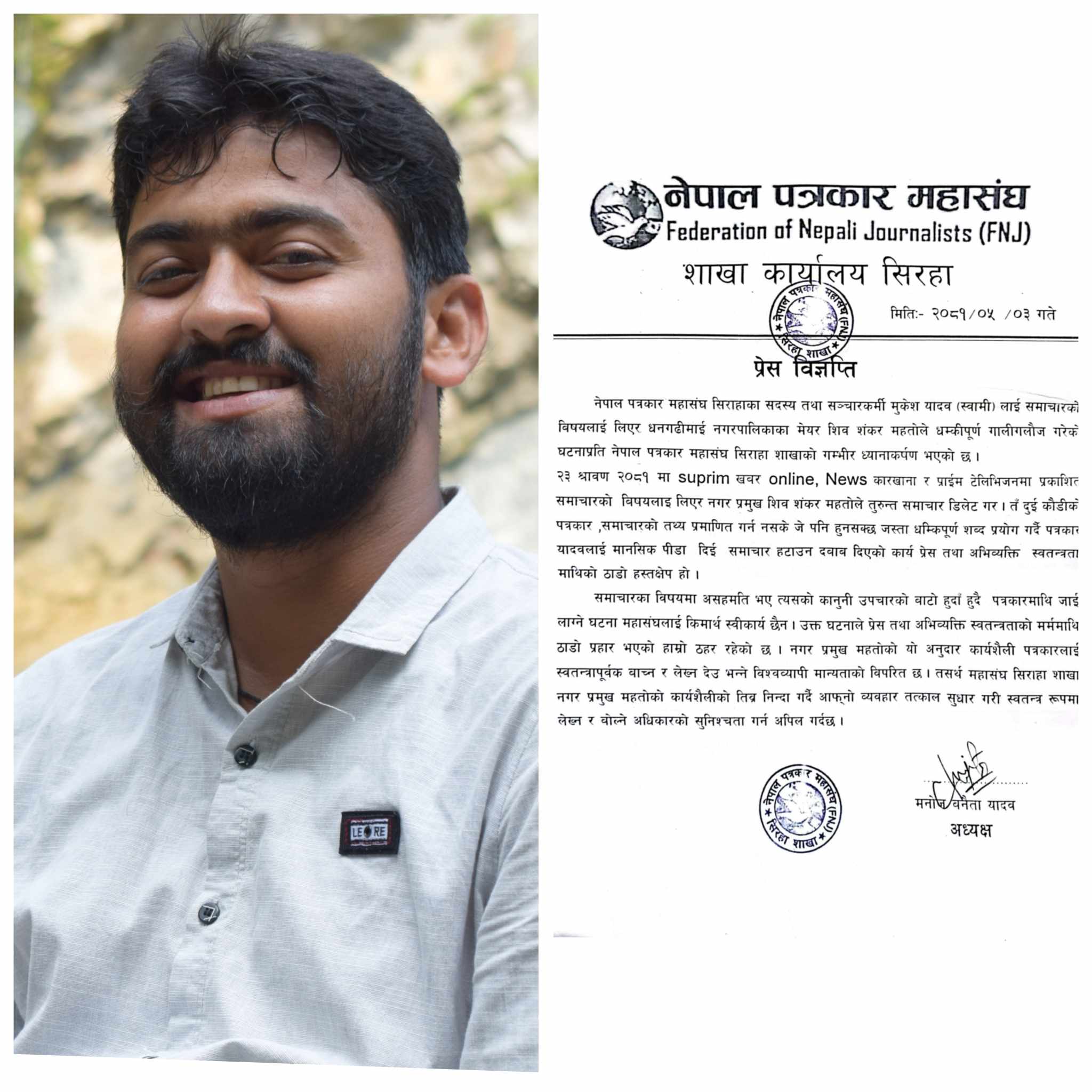 सिरहा। समाचार लेखेको विषयलाई लिएर धनगढीमाई नगरपालिकाका मेयर शिवशंकर महतोले नेपाल पत्रकार महासंघ सिरहाका सदस्य तथा सञ्चारकर्मी मुकेश कुमार यादवलाई धाकधम्की तथा गालीगलौज गरेको घटनाप्रति महासंघको गम्भिर ध्यानाकर्षण भएको छ।
