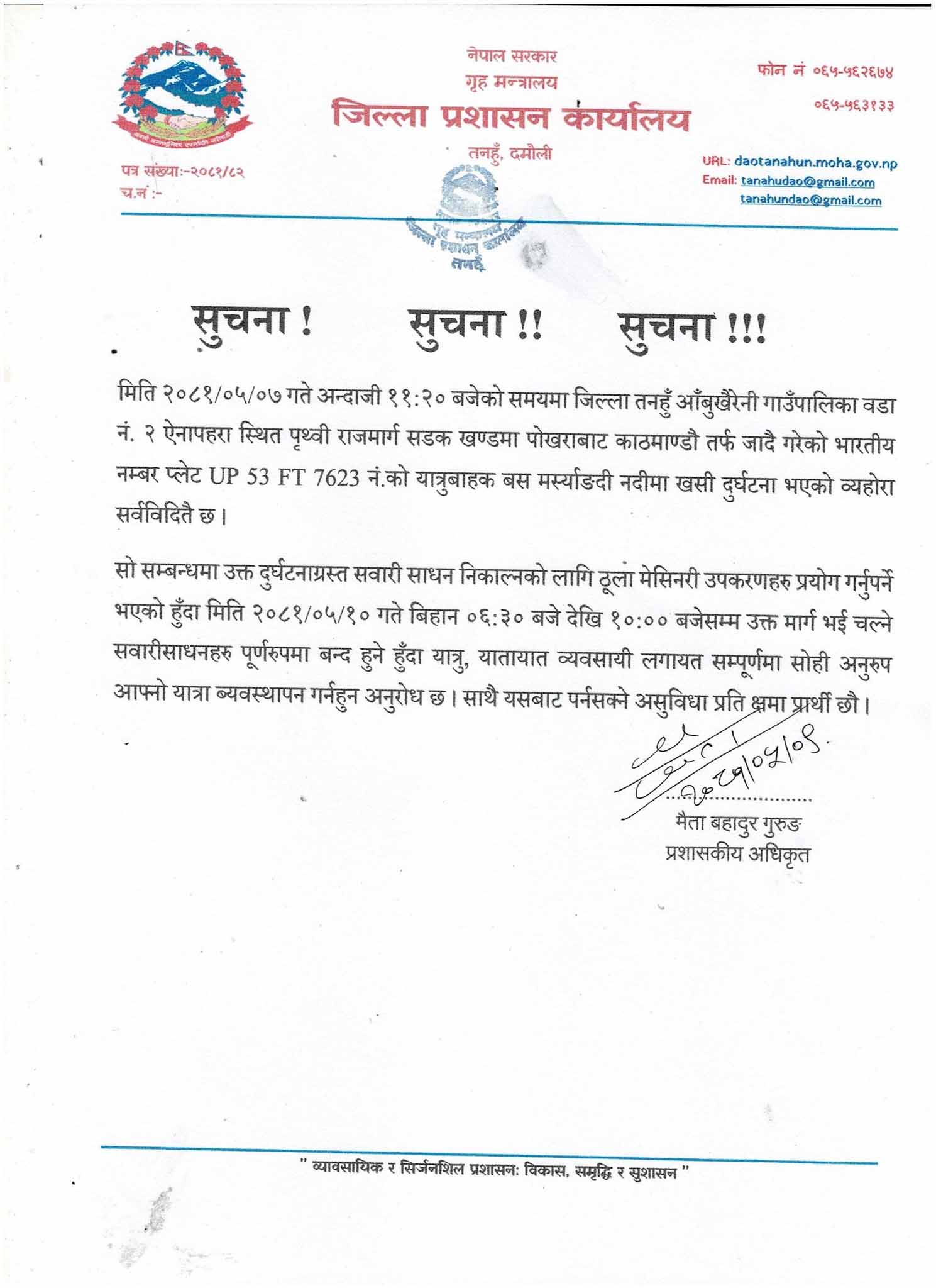 दमौली । तनहुँको आँबुखैरेनी गाउँपालिका-२ ऐनापहरास्थित मर्स्याङ्दी नदीमा गत शुक्रबार खसेको भारतीय नम्बर प्लेटको बस निकाल्नका लागि आज पृथ्वीराजमार्ग साढे तीन घण्टाका बन्द हुने भएको छ ।आइतबार जिल्ला प्रशासन कार्यालय तनहुँले एक सूचना जारी गर्दै राजमार्ग अवरुद्ध हुनेबारे जानकारी दिएको हो ।