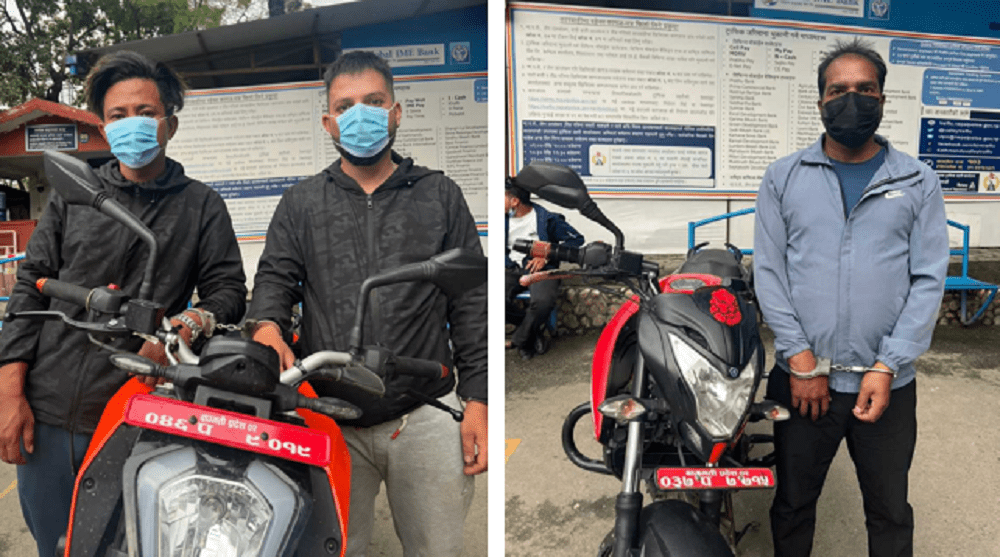 काठमाडौँ । काठमाडौँको चावहिल र स्वयम्भूबाटबाट मोटरसाइकल चोरीमा संलग्न तीन जनालाई ट्राफिक प्रहरीले नियन्त्रणमा लिएको छ ।नुवाकोट घर भई हाल काठमाडौंको चावहिल बस्ने २८ वर्षीय सन्तोष फुयाल, मकवानपुर घर भइ हाल स्वयम्भू बस्ने ३० वर्षीय सुर्य बहादुर स्याङ्तानलाई चावहिलबाट र पर्सा घर भई हाल भक्तपुरको सल्लाघारी बस्ने ३५ वर्षीय अजय शर्मालाई स्वयम्भूबाट हिजो ट्राफिक प्रहरीले नियन्त्रणमा लिएको हो ।