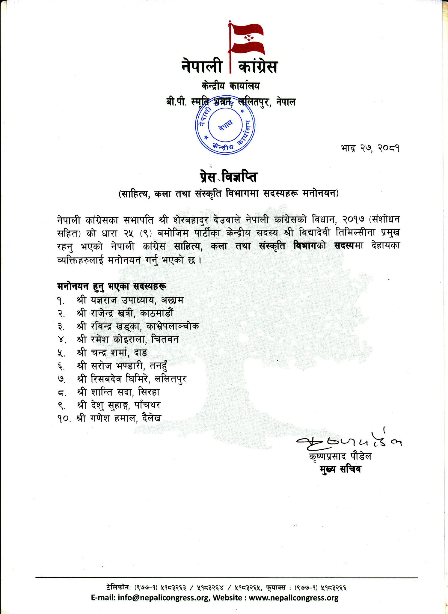 काठमाडौँ । नेपाली कांग्रेसका सभापति शेरबहादुर देउवाले साहित्य, कला तथा संस्कृति विभागमा १० जना सदस्य मनोनीत गरेका छन् । कांग्रेसको विधान, २०१७ (संशोधन सहित)को धारा २५ (९) बमोजिम देउवाले पार्टीका केन्द्रीय सदस्य विद्यादेवी तिमिल्सीना प्रमुख रहेको विभागमा सदस्य मनोनीत गरेको काँग्रेस केन्द्रीय कार्यालयले जानकारी दिएको छ ।