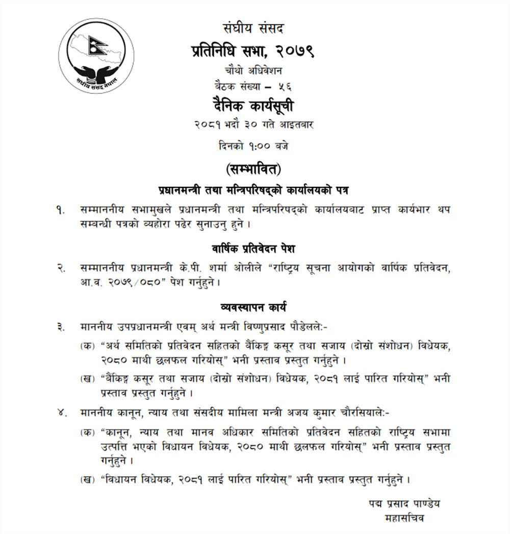 काठमाडौँ । प्रतिनिधि सभाको बैठक आज बस्दै छ । संघीय संसद सचिवालयका अनुसार अपराहन्न १ बजेदेखि बैठक बस्दै छ ।गत बुधबार बसेको बैठक माओवादी केन्द्रले अवरुद्ध गरेपछि स्थगित भएको थियो । संसदमा माओवादी जनयुद्धलाई लक्षित गर्दै प्रयोग भएको ‘हिंसा’ शब्द असंसदीय नभएको सभामुखले रुलिङ गरेपछि माओवादी केन्द्रले त्यसको विरोध गर्दै संसद अवरुद्ध गरेको थियो । अब माओवादी केन्द्रले सो रुलिङ फिर्ता नलिएसम्म संसदको अवरोध कायम राख्ने बताएको छ । आजको बैठको कार्यसूची: