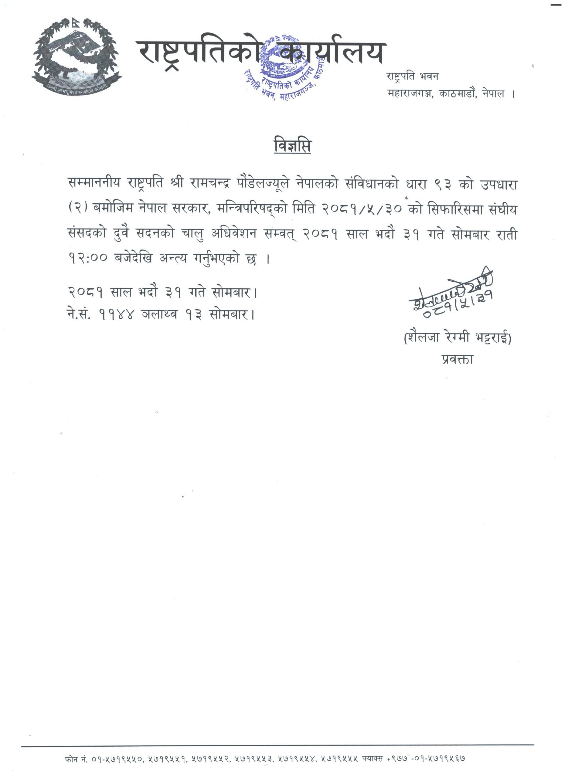 काठमाडौँ । राष्ट्रपति रामचन्द्र पौडेलले संघीय संसदको चालु अधिवेशनको अन्त्य गरेका छन् ।सोमबार राष्ट्रपति पौडेलले मन्त्रिपरिषद्को सिफारिस अनुसार संघीय संसदको दुवै सदनको चालु अधिवेसन सोमबार राति १२ बजेदेखि अन्त्य गरेको राष्ट्रपतिको सचिवालयले जानकारी दिएको छ ।यस अघि आइतबार बसेको मन्त्रिपरिषद्को बैठकले संसदको चालु अधिवेशन अन्त्य गर्न सिफारिश गरेको थियो ।