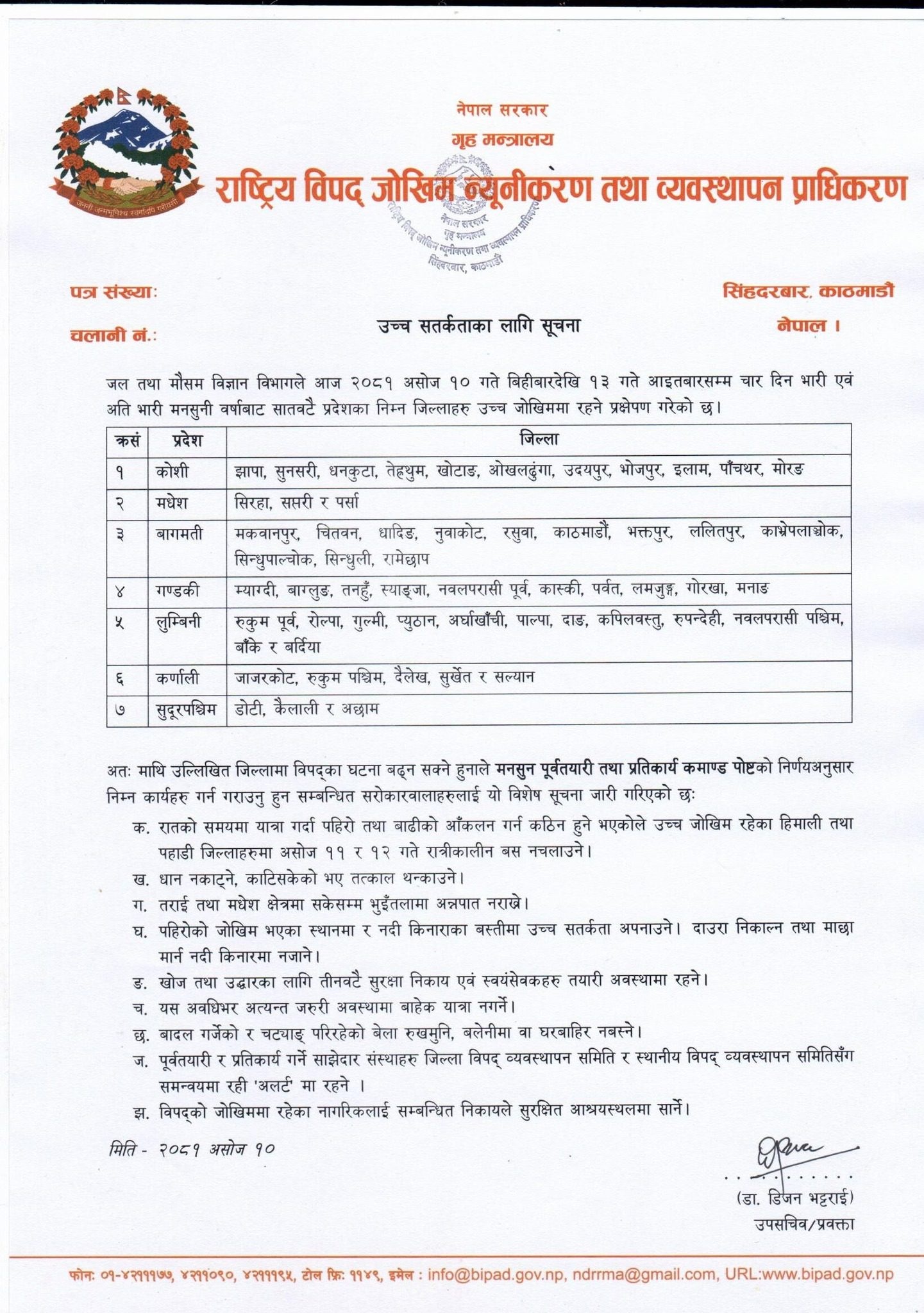 बिहीबारदेखि आइतबारसम्म चार दिन भारी वर्षा एवं अति भारी मनसुनी वर्षा हुने मौसम विभागले जनाएको छ ।  प्राधिकरणले धान नकाट्ने, काटिसकेको भए तत्काल थन्काउने, तराई तथा मधेस क्षेत्रमा भुइँतालमा अन्नपात नराख्ने, पहिरो जोखिम भएका स्थानमा र नदी किनारा बस्तीमा उच्च सतर्कता अपनाउन र दाउरा निकाल्न तथा माछा मार्न नदी किनारामा नजाने सूचना जारी गरेको छ ।