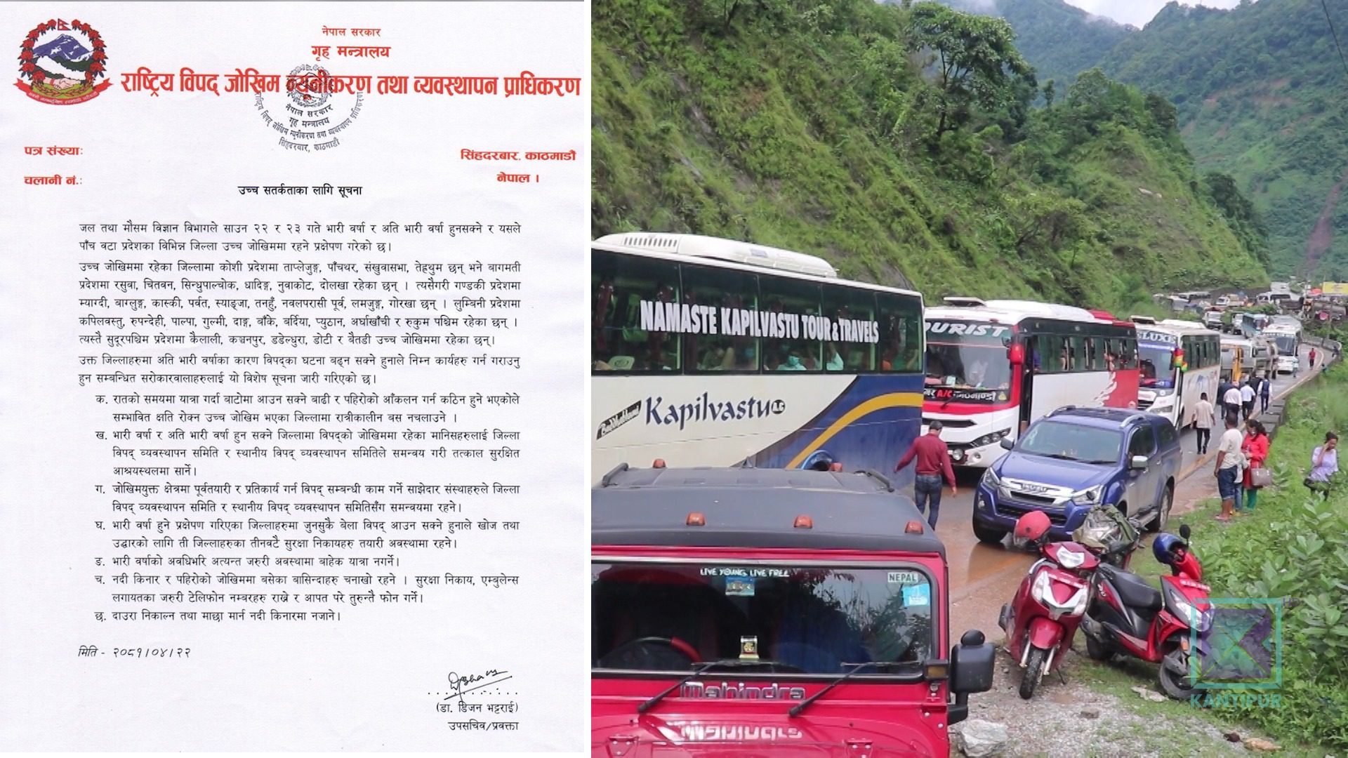 बिहीबारदेखि आइतबारसम्म चार दिन भारी वर्षा एवं अति भारी मनसुनी वर्षा हुने मौसम विभागले जनाएको छ ।  प्राधिकरणले धान नकाट्ने, काटिसकेको भए तत्काल थन्काउने, तराई तथा मधेस क्षेत्रमा भुइँतालमा अन्नपात नराख्ने, पहिरो जोखिम भएका स्थानमा र नदी किनारा बस्तीमा उच्च सतर्कता अपनाउन र दाउरा निकाल्न तथा माछा मार्न नदी किनारामा नजाने सूचना जारी गरेको छ ।