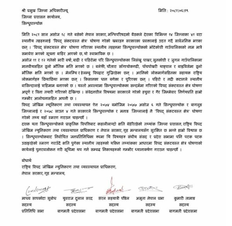 दशक यता सिन्धुपाल्चोकले प्राकृतिक विपत्तिबाट कहालीलाग्दो क्षति बेहेरिरहेको तथ्यांक जिल्ला प्रशासन, राष्ट्रिय विपद जोखिम न्युनिकरण तथा व्यवस्थापन प्राधिकरण र नेपाल सरकार, गृह मन्त्रालयसँग सुरक्षित छ भन्ने हाम्रो विश्वास छ । सिन्धुपाल्चोकबाट निर्वाचित जनप्रतिनिधिका रुपमा यि विषयहरु संघीय संसद र प्रदेश सभामा पनि पटक पटक उठाइरहेको स्मरण गराउँदै क्षति पुगेका स्थानीय तहहरुको यकिन तथ्यांकका आधारमा विपद संकटग्रस्त क्षेत्र घोषणाको कार्यलाई पुनरावलोकन गरी सूचिमा थप गर्न सम्वद्ध निकायहरुको गम्भीर ध्यानाकर्षण गराउन चाहन्छौं ।