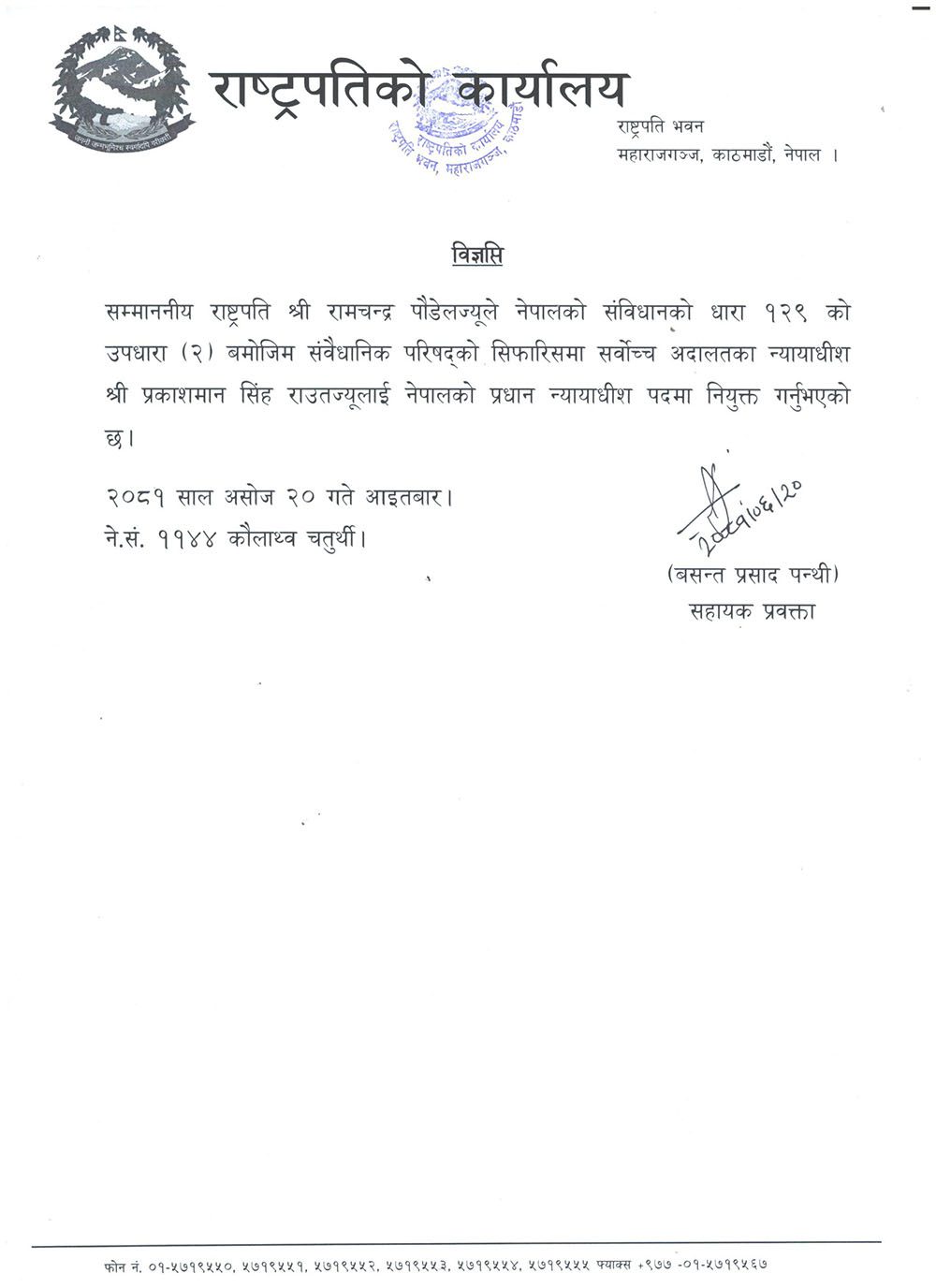 काठमाडौँ । राष्ट्रपति रामचन्द्र पौडेलले प्रकाशमानसिंह राउत प्रधानन्यायाधीश पदमा नियुक्त गरेका छन् ।आइतबार राष्ट्रपति पौडैलले राउतलाई प्रधानन्यायाधीश नियुक्त गरेको राष्ट्रपतिको कार्यालयले जानकारी दिएको छ ।यस अघि राउतलाई असोज १६ गतेको संसदीय सुनुवाइ समितिको बैठकमा प्रधानन्यायाधीशमा सर्वसम्मतिले अनुमोदन गरेको थियो ।संसदीय सुनुवाइ समितिबाट अनुमोदन भएपछि संवैधानिक परिषदको सिफारिसमा आइतबार राष्ट्रपति पौडेलले संविधानको धारा १२९ को उपधारा २ बमोजिम राउतलाई प्रधानन्यायाधीश नियुक्त गरेका हुन् ।