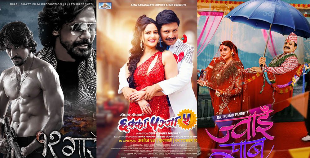 काठमाडौँ । दशैको फूलपातीबाट तीन नेपाली फिल्म ‘ज्वाइँ साब’, ‘१२ गाउँ’ र ‘छक्का पञ्जा ५’ एकसाथ प्रदर्शनमा आउने भएका छन् । ठुला तीन फिल्मको भिडन्तले नेपाली बक्स अफिसलाई रोमाञ्चक बनाउने भएको छ । सोमबारबाट यी तिनै फिल्मको मल्टीप्लेक्सहरुमा अग्रिम बुकिङ खुला भैसकेको छ । मल्टीप्लेक्सहरुमा सुपरहिट सिरिज‘छक्का पञ्जा ५’ अन्य दुई फिल्मभन्दा धेरै शोज पाएको छ ।