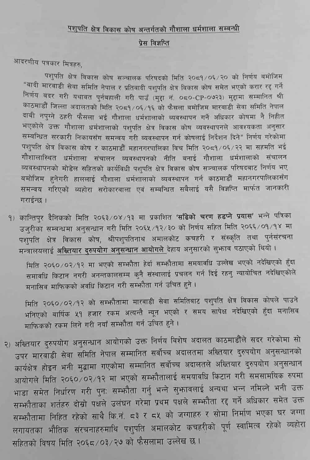 काठमाडौँ । पशुपति क्षेत्र विकास कोषले गौशाला धर्मशालामा मारवाडी सेवा समितिको मोही हक नलाग्ने स्पष्ट गरेको छ । मंगलबार पत्रकार सम्मेलन गर्दै कोषले श्री पशुपतिनाथको जग्गा र जग्गामा रहेको सम्पत्ति संरक्षण गर्नु सबैको कर्तव्य हुने बताउदै यो जग्गामा मारवाडी समितिको मोही हक नलाग्ने स्पष्ट गरको हो ।