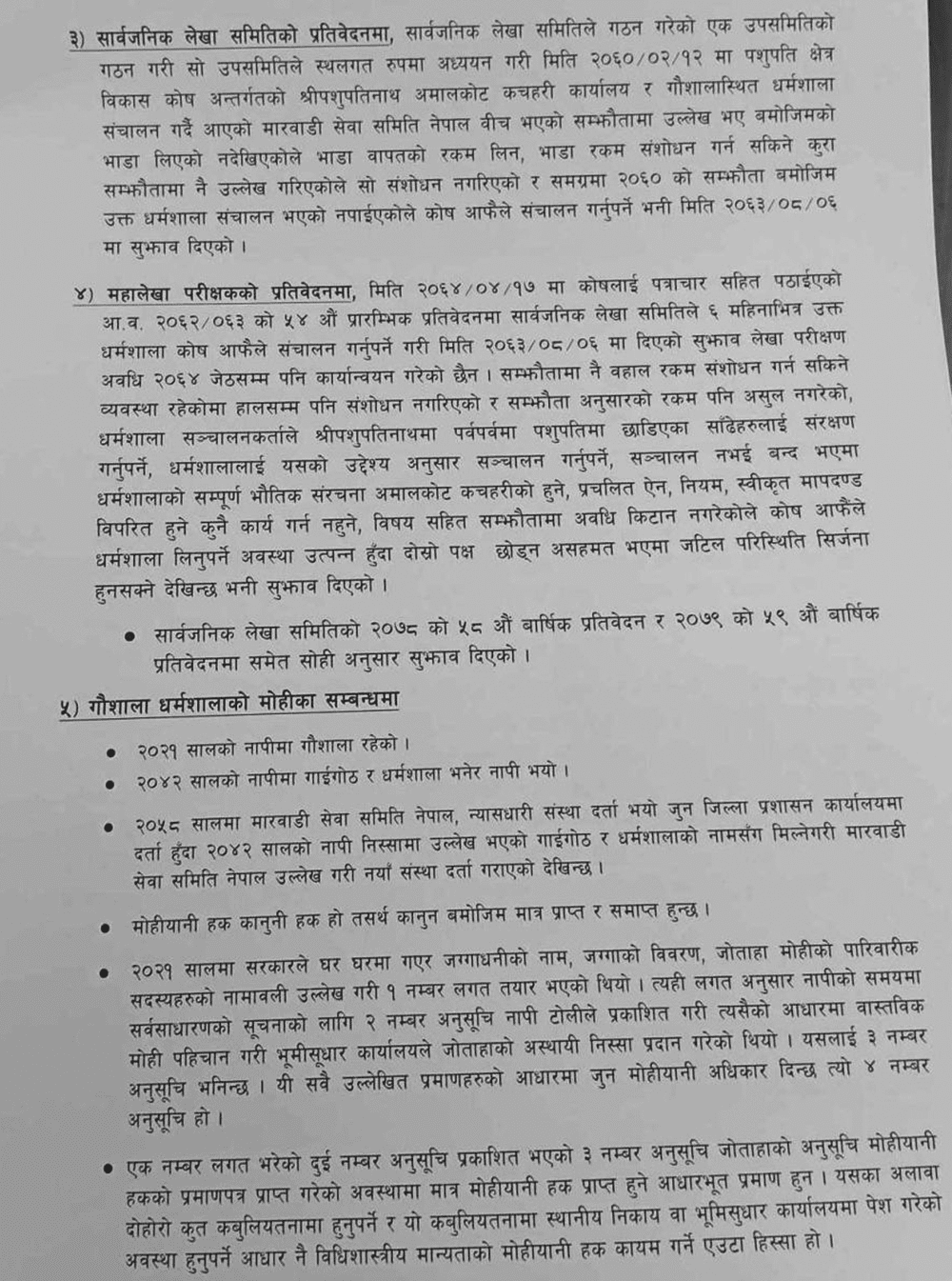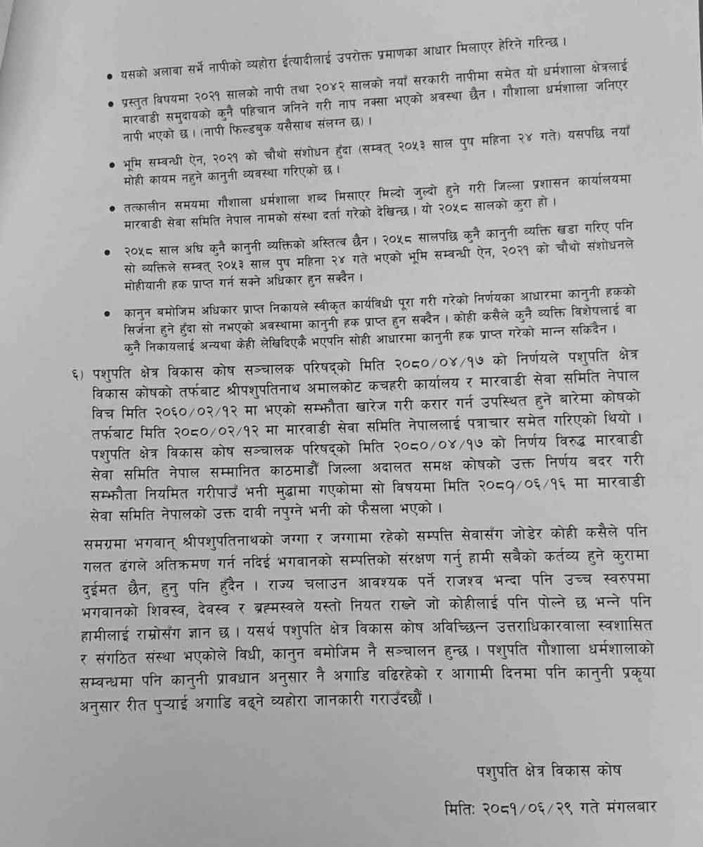 काठमाडौँ । पशुपति क्षेत्र विकास कोषले गौशाला धर्मशालामा मारवाडी सेवा समितिको मोही हक नलाग्ने स्पष्ट गरेको छ । मंगलबार पत्रकार सम्मेलन गर्दै कोषले श्री पशुपतिनाथको जग्गा र जग्गामा रहेको सम्पत्ति संरक्षण गर्नु सबैको कर्तव्य हुने बताउदै यो जग्गामा मारवाडी समितिको मोही हक नलाग्ने स्पष्ट गरको हो ।