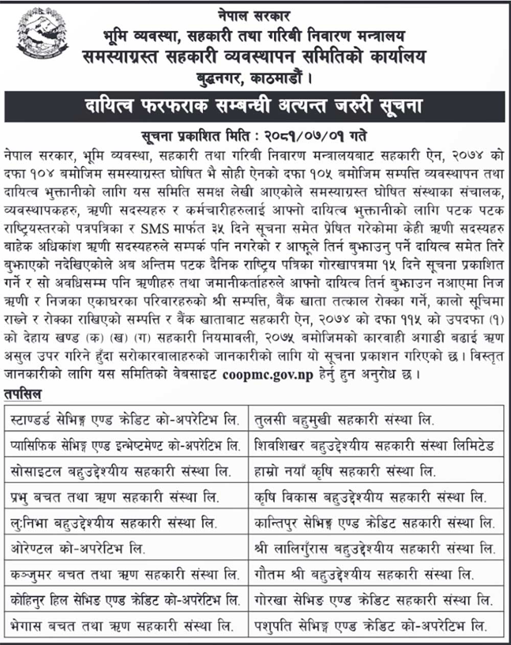 समितिले सार्वजनिक सूचना प्रकाशित गरी समस्याग्रस्त घोषित सहकारी संस्थाका सञ्चालक, व्यवस्थापक, ऋणी सदस्य र कर्मचारीलाई पटकपटक ३५ दिने सूचना, पत्राचार गर्दा पनि केही ऋणीबाहेक अधिकांश सम्पर्कमा नआएकाले सार्वजनिक सूचनामार्फत १५ दिनभित्र दायित्व भुक्तानी गर्न निर्देशन दिएको हो ।