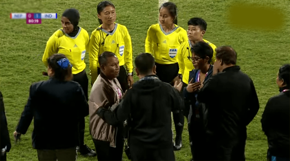काठमाडौँ । नेपाल र भारतबीचको साफ महिला च्याम्पियनसिपको सेमिफाइनल खेलमा तनाव भएको छ ।खेलमा नेपालले गरेको गोललाई रेफ्रीले मान्यता दिन अस्वीकार गरेपछि नेपाली खेलाडीहरुले विरोध गरिरहेका छन् । खेलमा भारतले खेलको ७०औ मिनेटमा गोल गरेर १-० को अग्रता लिएको थियो । त्यसपछि खेल शुरु भएपछि नेपालले लगतै गरेको गोललाई रेफ्रीले मान्यता नदिएपछि नेपालले विरोध गरेको छ । अहिले खेल अवरुद्ध भएको छ र रेफ्रीहरु छलफलमा रहेका छन् ।रेफ्रीले खेल फेरी शुरु गर्न खोजेपछि नेपालले गोलको मान्यता नदिएको भन्दै विरोध गरिरहेको छ ।यसअघि पहिलो हाफमा पनि रेफ्रीले नेपालले पेनाल्टी क्षेत्रमा भएको ह्याण्ड बल दिन अस्वीकार गरेकी थिइन् ।