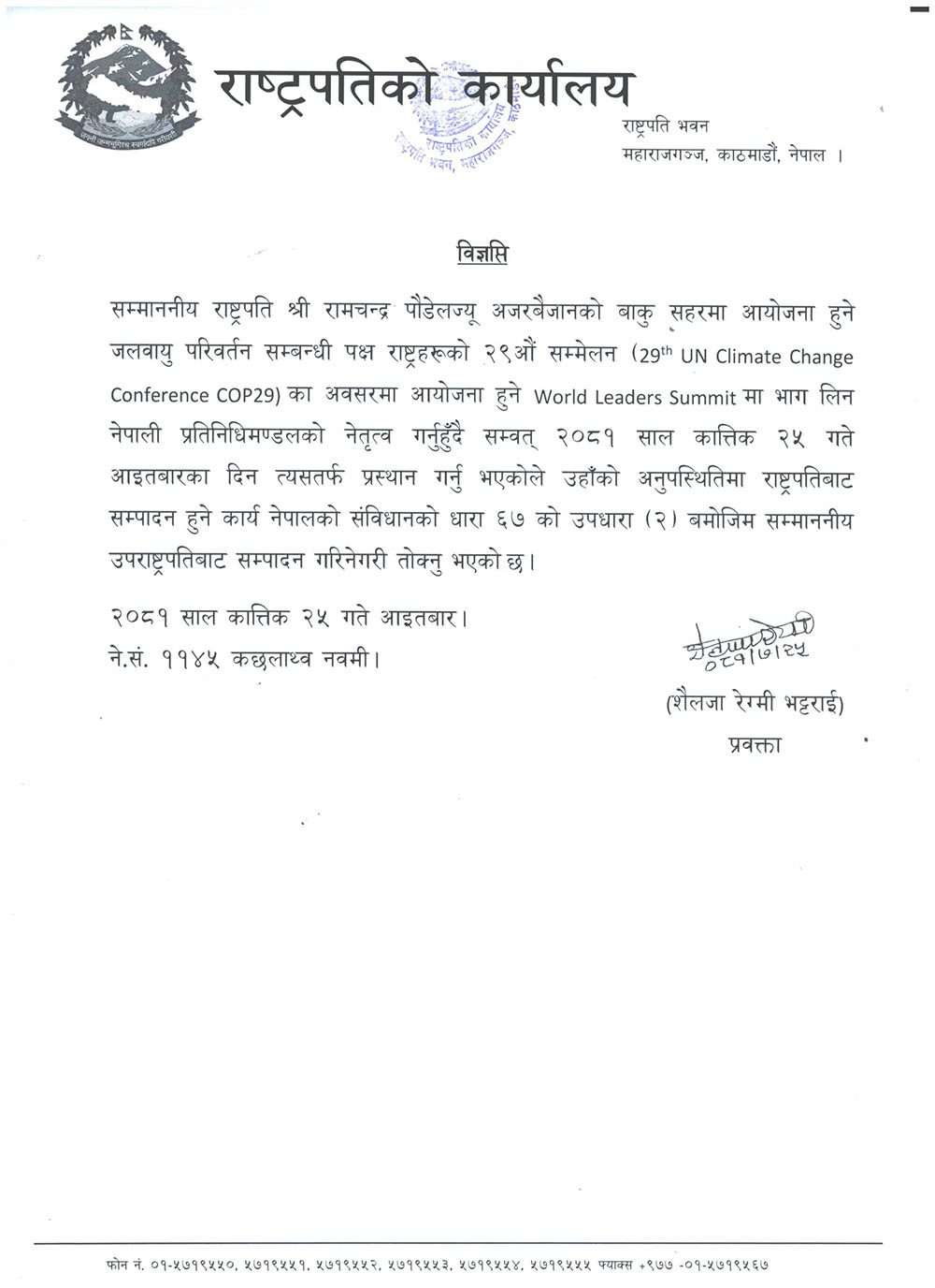 काठमाडौँ । राष्ट्रपति रामचन्द्र पौडेलले उपराष्ट्रपति रामसहाय प्रसाद यादवलाई कार्यभार तोकेका छन् ।अजरबैजानको बाकु सहरमा आयोजना हुने जलवायु परिवर्तन सम्बन्धी पक्ष राष्ट्रहरूको २९औं सम्मेलनमा भाग लिन आज त्यसतर्फ प्रस्थान गरेका राष्ट्रपति पौडेलले आफ्नो अनुपस्थितिमा राष्ट्रपतिबाट सम्पादन हुने कार्य नेपालको संविधानको धारा ६७ को उपधारा (२) बमोजिम उपराष्ट्रपति यादवबाट सम्पादन गरिनेगरी तोकेको राष्ट्रपतिको कार्यालयले जनाएको छ ।सम्मेलनमा सहभागी भई राष्ट्रपति पौडेल यही कात्तिक ३० गते शुक्रबार स्वदेश फर्किने कार्यतालिका रहेको छ ।