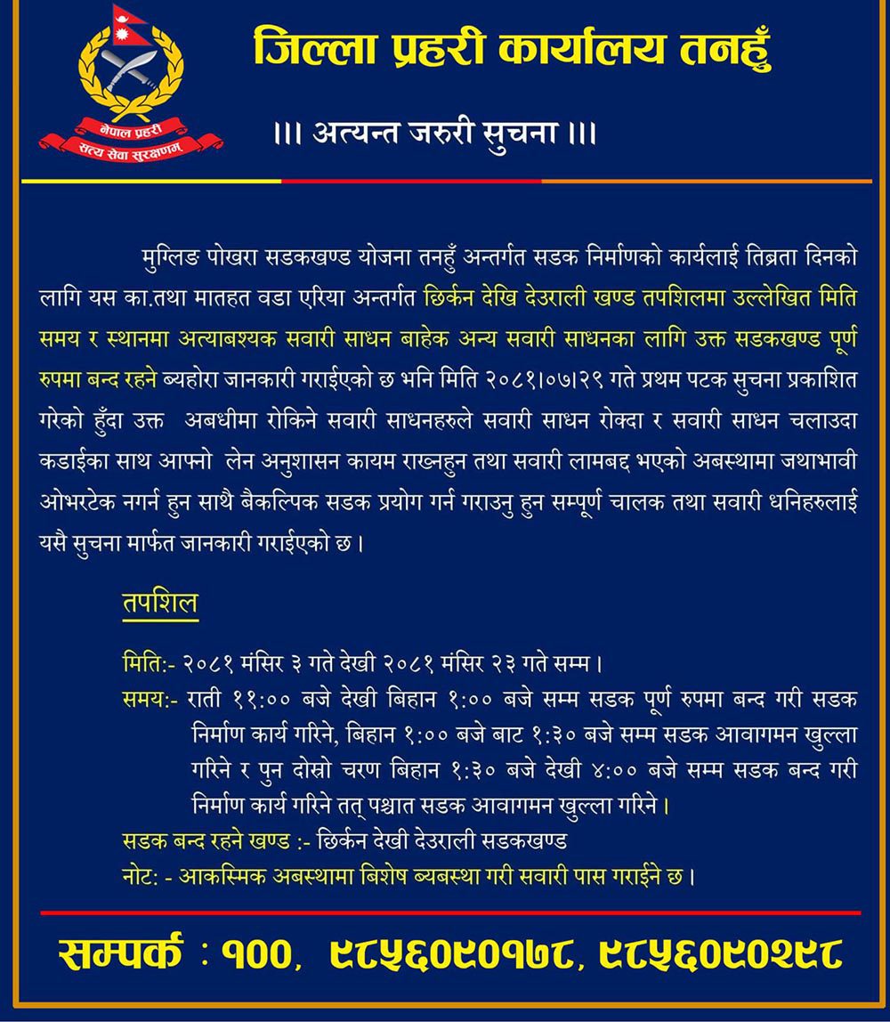 काठमाडौँ । मुग्लिङ-पोखरा सडकखण्ड दैनिक साढे ४ घण्टा बन्द हुने भएको छ ।तनहुँ प्रहरीका अनुसार मुग्लिन पोखरा सडक खण्डको छिर्कनदेखि देउराली सडक खण्डको निर्माणको काम गरिने भएकाले मङ्सिर ३ गतेदेखि २३ गतेसम्म हरेक दिन साढे ४ घण्टा बन्द हुने भएको हो ।सडकराति ११ बजेदेखि बिहान १ बजेसम्म तथा बिहान साढे एक बजेदेखि चार बजेसम्म पूर्ण रुपमा बन्द हुने प्रहरीले जनाएको छ ।सो समयमा सडक पूर्ण बन्द गरेर निर्माणको काम गरिने भएको छ । सो समयमा आकस्मिक अवस्थामा भने सवारी पास गराइने प्रहरीले जनाएको छ ।