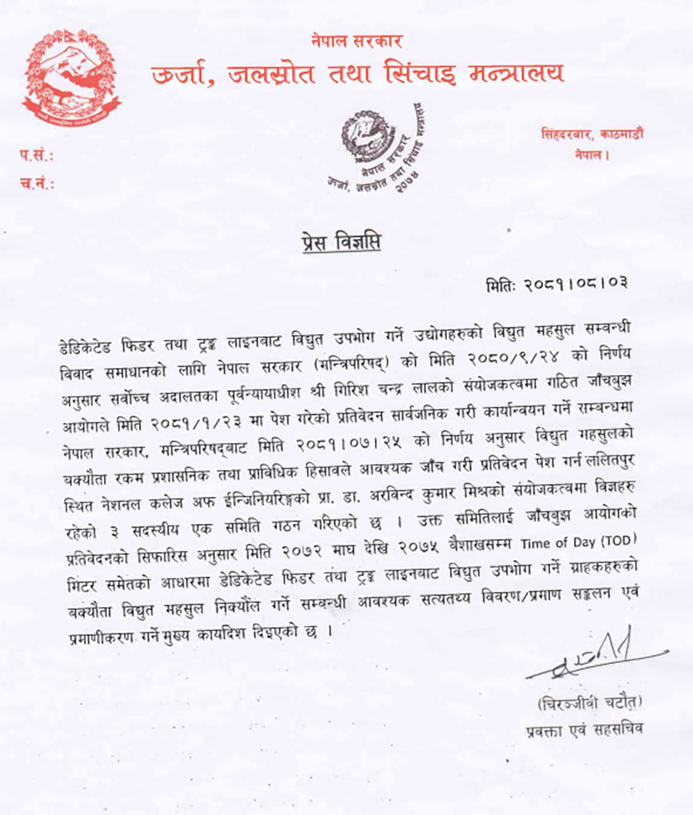 समितिको सदस्यमा ‘चार्टड एकाउन्टेन्ट’ सुजनकुमार काफ्ले र श्रीरामराज पाण्डे छन् । मन्त्रालयले समितिले गिरिशचन्द्र लाल नेतृत्वको आयोगले गरेका सिफारिस र मन्त्रिपरिषद्ले गरेका निर्णयका आधारमा पहिले काटेका बिलबिजकलाई ‘टाइम अफ डे’ (टीओडी) मिटरका आधारमा पुनःगणना गरी जाँच गर्ने र उद्योगको बक्यौता महसुल निर्क्यौल गर्ने कार्यादेश दिएको छ ।