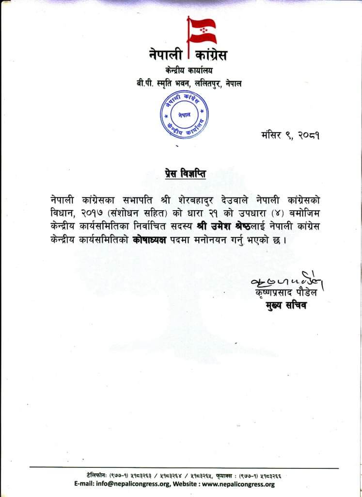 काठमाडौं। नेपाली कांग्रेसका कोषाध्यक्षमा उमेश श्रेष्ठ नियुक्त भएका छन् ।सभापति शेरबहादुर देउवाले उनलाई आज नियुक्त गरेका हुन् ।प्रतिनिधिसभा निर्वाचनमा राष्ट्रिय स्वतन्त्र पार्टीका सभापति रबि लामिछानेवाट पराजित श्रेष्ठ देउवा निकट मानिन्छन् ।महाधिवेसन पछि उक्त पद रिक्त थियो ।