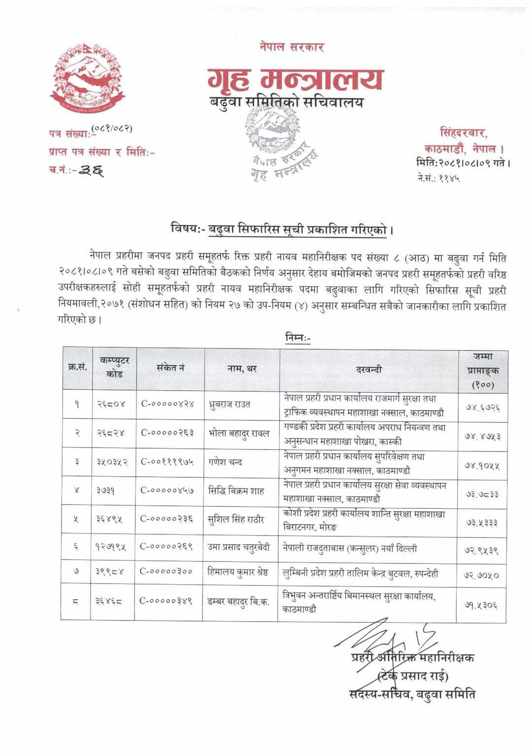 काठमाडौं । नेपाल प्रहरी ८ जना वरिष्ठ उपरीक्षकहरुलाई नायब महानिरीक्षक (डीआईजी) मा बढुवा गर्ने सिफारिस गरिएको छ।बढुवा सिफारिस सूचीको पहिलो नम्बरमा धुर्वराज राउत छन् भने साथै भोला बहादुर रावल, गणेश चन्द, सिद्धि विक्रम शाह, चतुर्वेदी हिमालयकुमार श्रेष्ठ र डम्बर बहादुर बिक लाई बढुवाका लागि सिफारिस गरिएको छ।