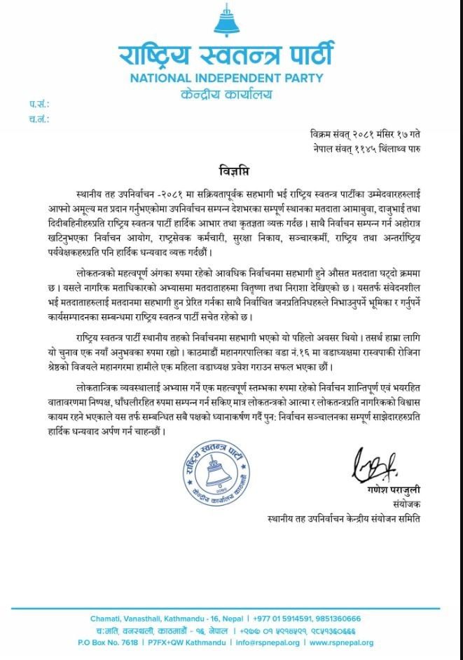 स्थानीय तह उपनिर्वाचनमा आफ्ना उम्मेदवारलाई मत दिएकोमा मतदाताहरूलाई रास्वपाले धन्यवाद ज्ञापनसमेत गरेको छ।