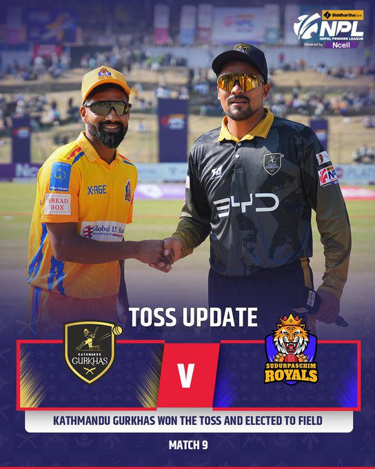 काठमाडाैं। नेपाल प्रिमियर लिग (एनपीएल)को आजको दोस्रो खेलमा काठमाडौँ गुर्खाजले सुदूरपश्चिम रोयल्सविरुद्ध पहिले फिल्डिङ गर्ने भएको छ ।
