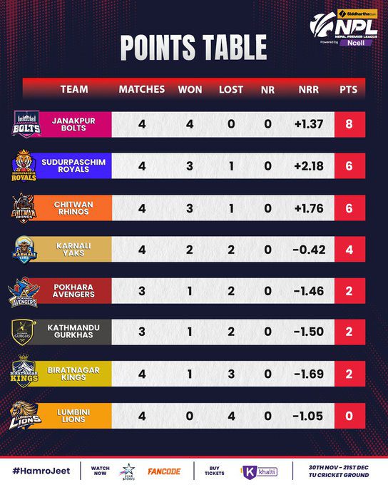 काठमाडाैं। आज नेपाल प्रिमियर लिग (एनपीएल) को अठाराैं र उन्नाइसाैं खेल हुदैँछ ।