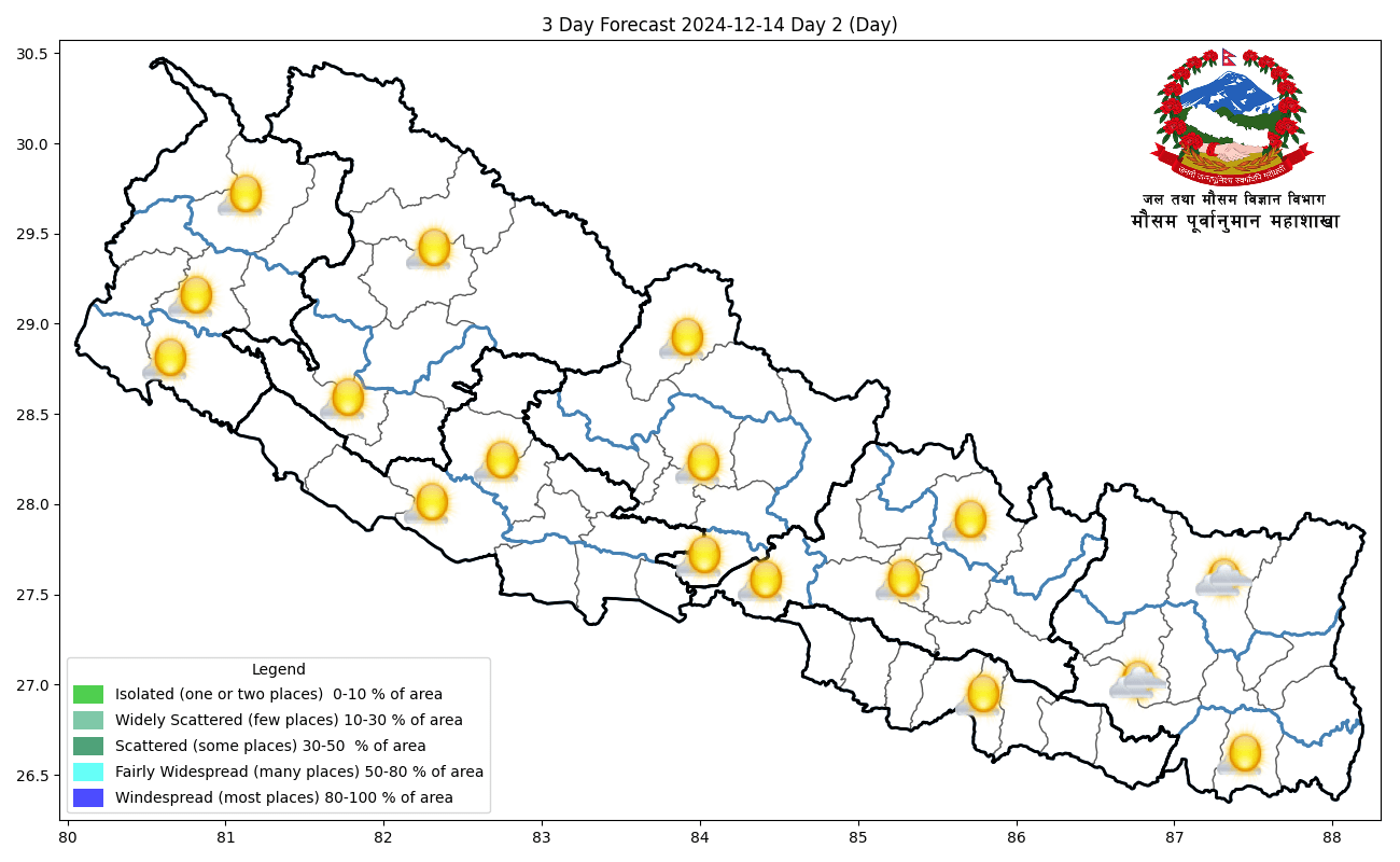 काठमाडौं। हाल देशमा पश्चिमी वायुको सामान्य प्रभाव रहेको छ । जल तथा मौसम विज्ञान विभाग, मौसम पूर्वानुमान महाशाखाका अनुसार हाल देशभर मौसम मुख्यतया सफा रहेको छ । तराईका केही स्थानहरुमा हुस्सु र कुहिरो लागेको अवस्था छ । दिउँसो देशभर मौसम मुख्यतया सफा रहने छ । राती भने देशको गण्डकी प्रदेश, कर्णाली प्रदेश र सुदूरपश्चिम प्रदेशका पहाडी भू-भागमा आंशिक बदली तथा बाँकी भू-भागमा मौसम मुख्यतया सफा रहने छ । गण्डकी प्रदेशको उच्च पहाडी तथा हिमाली भू-भागका एक दुई स्थानमा हल्का हिमपातको सम्भावना रहेको छ । बिहानको समयमा तराई तथा उपत्यका केही स्थानहरूमा हुस्सु साथै थोरै स्थानहरुमा कुहिरोको सम्भावना रहेकोले दैनिक जनजीवन,यातायात तथा हवाई उड्डयनमा क्षणिक र आंशिक असर पर्न सक्ने हुनाले आवश्यक सतर्कता अपनाउन महाशाखाले अनुरोध गरेको छ।