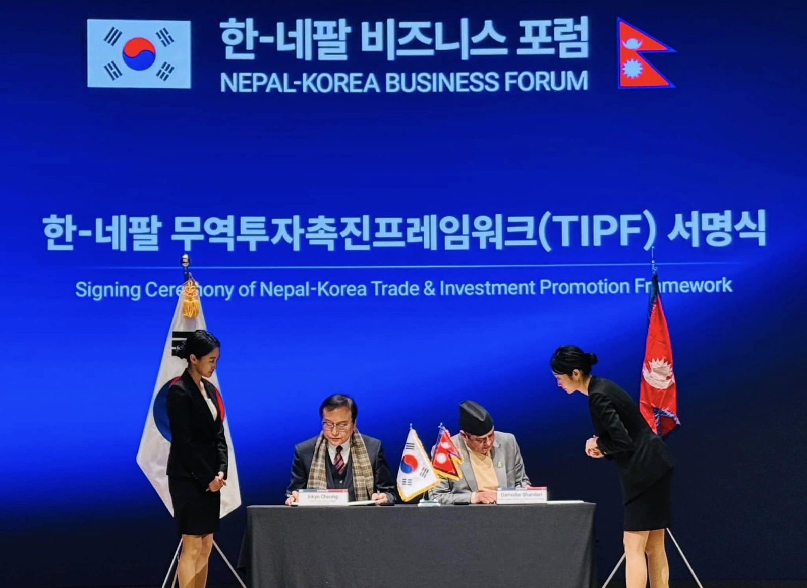 दक्षिण कोरिया । उद्योग, वाणिज्य तथा आपुर्ती मन्त्री दामोदर भण्डारी र दक्षिण कोरियाली समकक्षी इन्क्यो च्योङ बीच द्विपक्षीय व्यापार तथा लगानी प्रर्वद्धन फ्रेमवर्कमा सम्झौता भएको छ । गणतन्त्र दक्षिण कोरिया र नेपालको द्विपक्षीय सम्बन्ध स्थापित भएको ५० वर्ष पुगेको अवसरमा कोरिया भ्रमणमा रहनुभएका मन्त्री भण्डारीले आज कोरियाको राजधानी सिओलमा आयोजीत एक समारोहका बीच उक्त सम्झौतामा हस्ताक्षर भएको हो ।