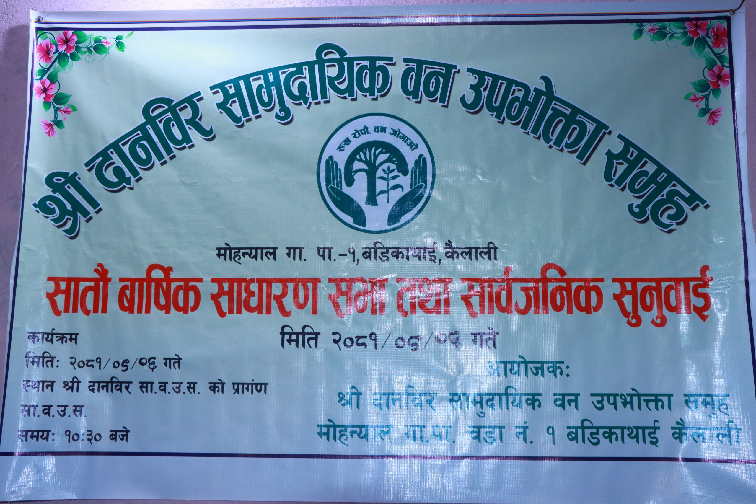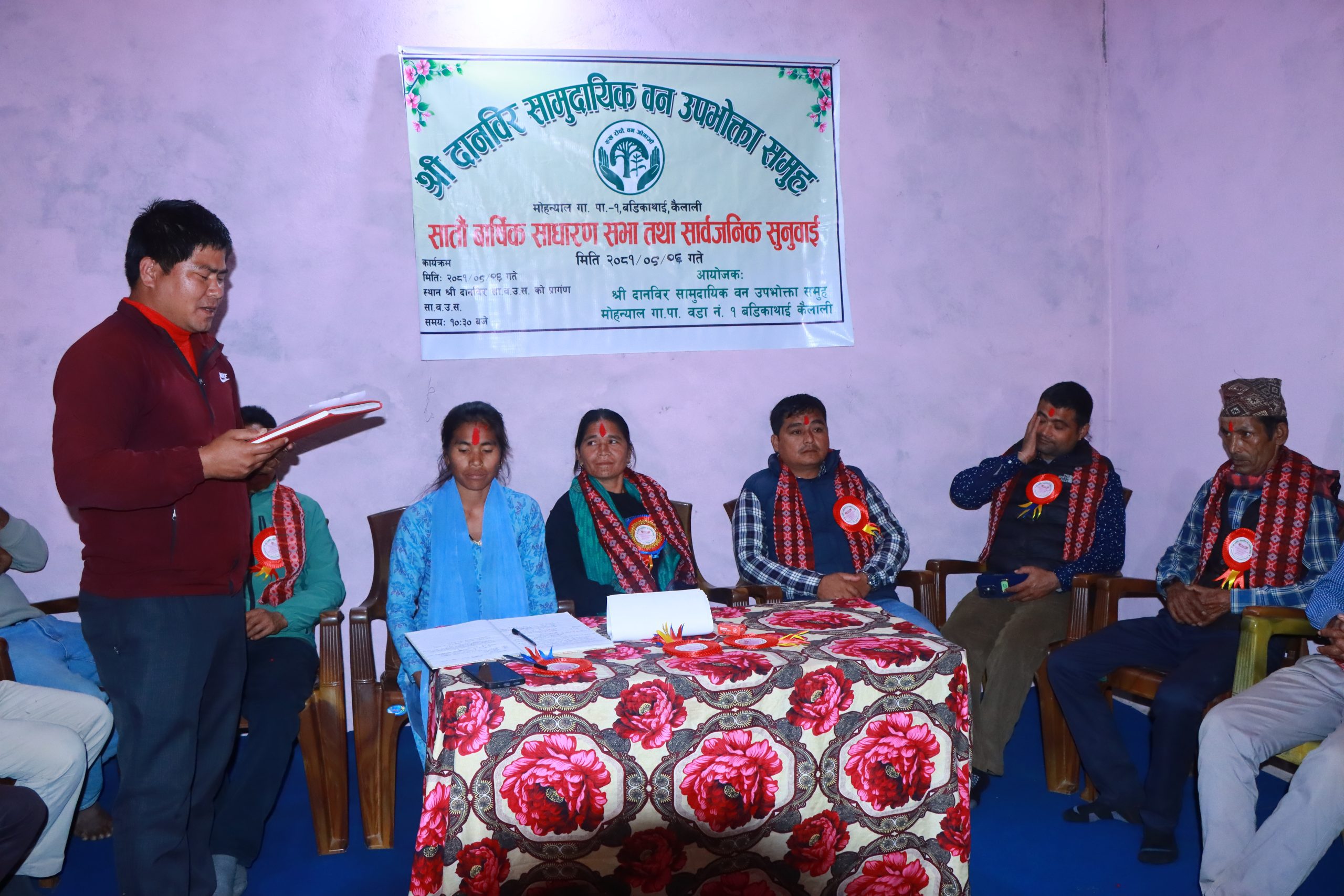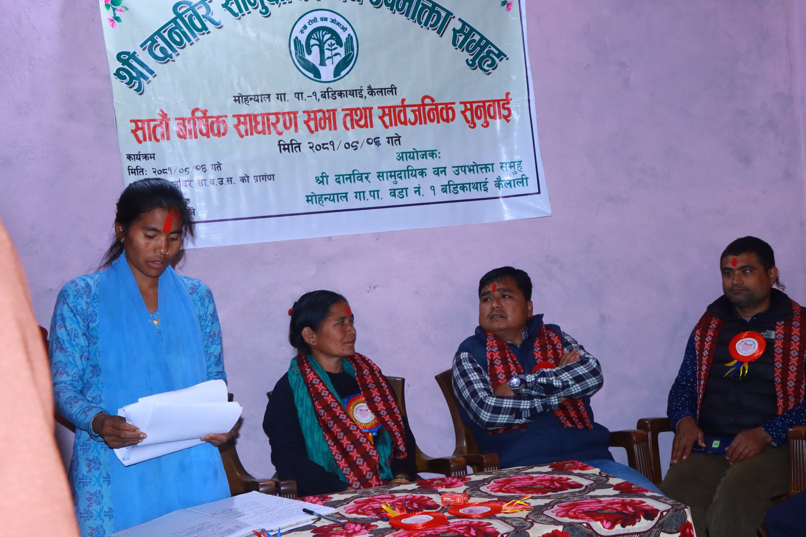 कैलाली । कैलालीको मोहन्याल गाउँपालिका वडा नं. १ स्थित दानवीर सामुदायिक वन उपभोक्ता समूहको सातौं वार्षिक साधारणसभा तथा सार्वजनिक सुनुवाई कार्यक्रम सम्पन्न भएको छ । सो सामुदायिक वनले आर्थिक वर्ष २०८०/२०८१ को कुल ६२ लाख ४७ हजार १९७ रुपैयाँ आयव्यय सार्वजनिक गरेको हो । वनकी अध्यक्ष कल्पना देवी थापाको सभापतित्वमा भएको कार्यक्रमका प्रमुख अतिथी वडाध्यक्ष पिरम बुढा रहेका थिए । कार्यक्रममा सबडिभिजन वन कार्यालय फलेबिसौनाका वन प्राविधिक पुर्णप्रसाद शर्मा र राउन्ने सामुदायिक वनका अध्यक्ष हिरासिंह सापकोटा विशिष्ट अतिथि रहेका थिए । सो अवसरमा वडाध्यक्ष बुढाले सामुदायिक वनले नियमित साधारण सभा तथा सार्वजनिक सुनुवाई गर्दै आएको बताउँदै धन्यवाद दिए । उनले वनको संरक्षण गर्दै दीगो विकास तथा उपभोक्ता लाभान्वित हुने कार्यक्रम सञ्चालन गर्न आवश्यक रहेको औंल्याए । सामुदायिक वनका पदाधिकारी, उपभोक्ता तथा वन कर्मचारीको विधानले नै जिम्मेवारी दिएको बताउँदै उनले शिक्षा, स्वास्थ्य, सिचाइँ, वन विकास र उपभोक्ताको आयआर्जन तथा सीपमूलक कार्यक्रम सञ्चालन गर्न सो सामुदायिक वन सक्षम भएको बताए ।