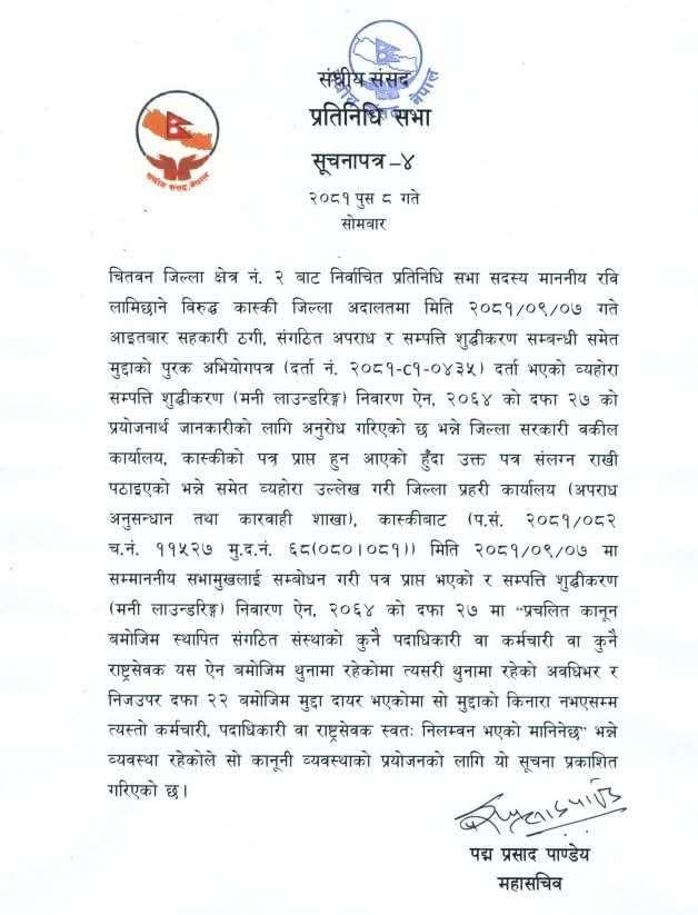 सरकारी वकिलको कार्यालय, कास्कीले लामिछाने, छविलाल जोशीसहित ४४ जनालाई आइतबार सहकारी ठगीको आरोपमा प्रतिवादी बनाएर मुद्दा दर्ता गरेको हो । पाँच जनालाई बिगो अनुसारको सम्पत्ति जफत गर्ने प्रयोजनका लागि मात्र प्रतिवादी कायम गरिएको छ । पूर्व डीआईजी छविलाल जोशी पक्राउ परेको दिनदेखि ९२औँ दिनमा सरकारले आइतबार अभियोगपत्र दर्ता गरेको हो । लामिछानेविरुद्ध भने तीन वटा कसुरमा मुद्दा दर्ता भएको छ । लामिछानेविरुद्ध सङ्गठित अपराध, सहकारी ठगी र सम्पत्ति शुद्धीकरण सम्बन्धी कसुरमा अभियोग पत्र दर्ता गरिएको छ ।