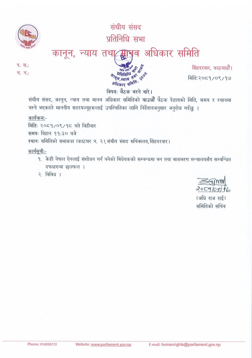 काठमाडौं । संघीय संसदको ६ वटा समितिका बैठक बस्दैँछ । संघीय संसद सचिवालयका अनुसार सबै समितिको बैठक सिंहदरवारस्थित कार्यालयमा हुनेछन् । जसअनुसार अन्तर्राष्ट्रिय सम्बन्ध र पर्यटन समितिको बैठकमा संस्कृति, पर्यटन तथा नागरिक उड्डयन मन्त्रालयको आ.ब् २०८१÷८२ को कार्यक्रम तथा हालसम्मको प्रगतिका बारेमा छलफल हुनेछ । बैठक बिहान ११ः०० बजे बोलाइएको छ ।