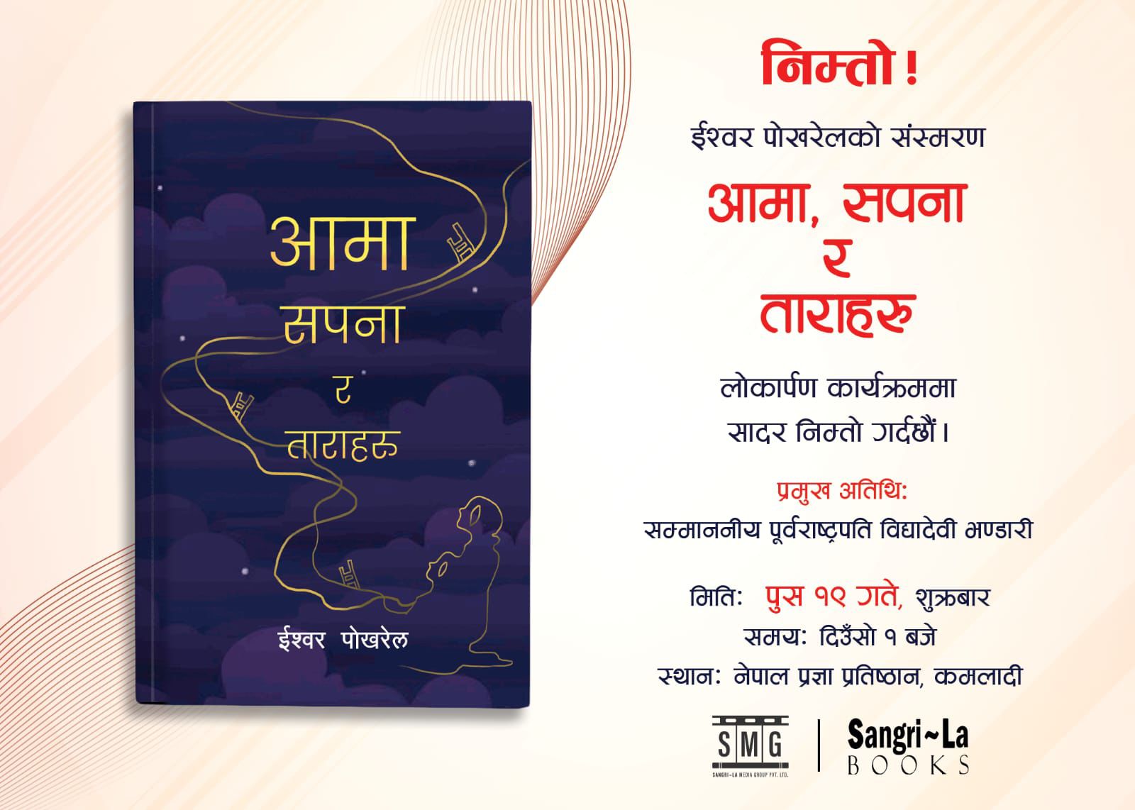 काठमाडौं। नेकपा एमालेका वरिष्ठ उपाध्यक्ष ईश्वर पोखरेल ‘आमा, सपना र ताराहरू’ नामक पुस्तक विमोचन भएको छ । शुक्रबार काठमाडौँमा आयोजित एक कार्यक्रममा पूर्वराष्ट्रपति विद्यादेवी भण्डारी, कांग्रेस महामन्त्री विश्वप्रकाश शर्मा, एमाले उपमहासचिव प्रदीप ज्ञवाली र उपप्राध्यापक डा।विन्दु शर्माले संयुक्त रूपमा विमोचन गरेका हुन् ।