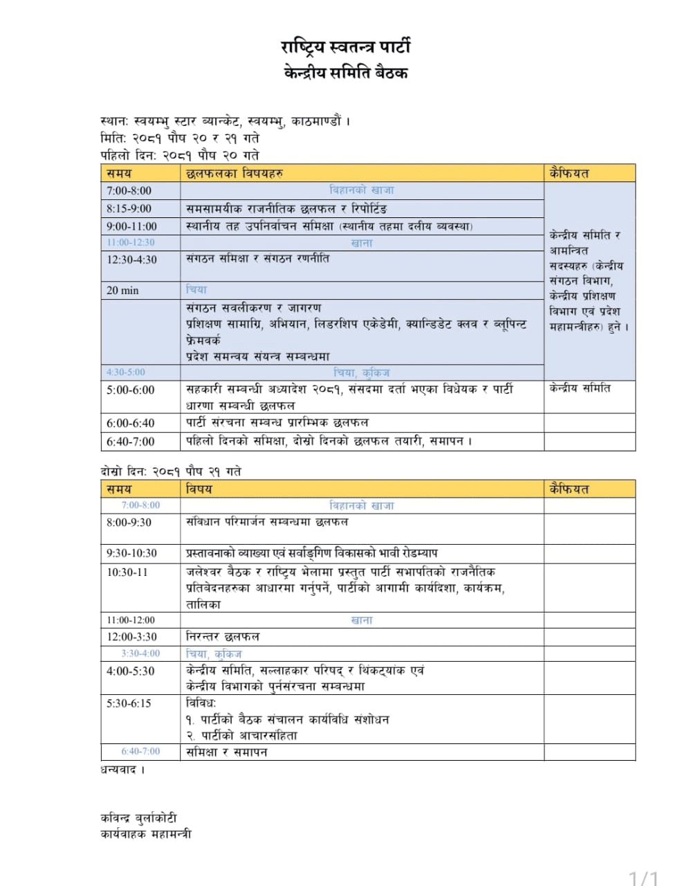उता, केन्द्रिय समिति सदस्यहरू मात्रै रहने बैठकमा सहकारी सबन्धी अध्यादेश २०८१, संसदमा दर्ता भएका बिधेयक र पार्टी धारणा सबन्धी छलफल , पार्टी संरचना सबन्धमा प्रारम्भिक छलफल गरेर पहिलो दिनको बैठकको समिक्षा र दोस्रो दिनको छलफलको तयारी गरिने महामन्त्री बुर्लाकोटीले जानकारी दिए । सभापति रबि लामिछाने सहकारी ठगी प्रकरणमा पक्राउ परी हिरासतमा रहे पछि कार्यबहाक सभापति डीपी अर्यालको अध्यक्षता पहिलो पटक केन्द्रिय समिति बैठक बस्न लागेको हो ।