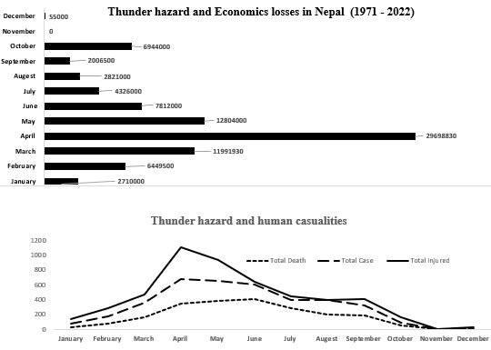 यस अवधिमा जम्मा ३७३१ चट्याङ परेको छ। अप्रिल, मे र जुन महिनामा सबैभन्दा बढी चट्याङ परेको देखिन्छ जुन क्रमशः ६७८ (१८.२ प्रतिशत), ६५४ (१७.५ प्रतिशत), र ५९९ (१६.१ प्रतिशत) रहेको छ। सबैभन्दा बढी मासिक मानवीय क्षति क्रमशः जुन (४०४), मे (३८६) र अप्रिल (३४६) थियो। त्यहाँ सबैभन्दा गहन तीन महिना कुल चट्याङ संख्या र मानव क्षति संख्या एकदम विपरीत दिशा देखिन्छ।