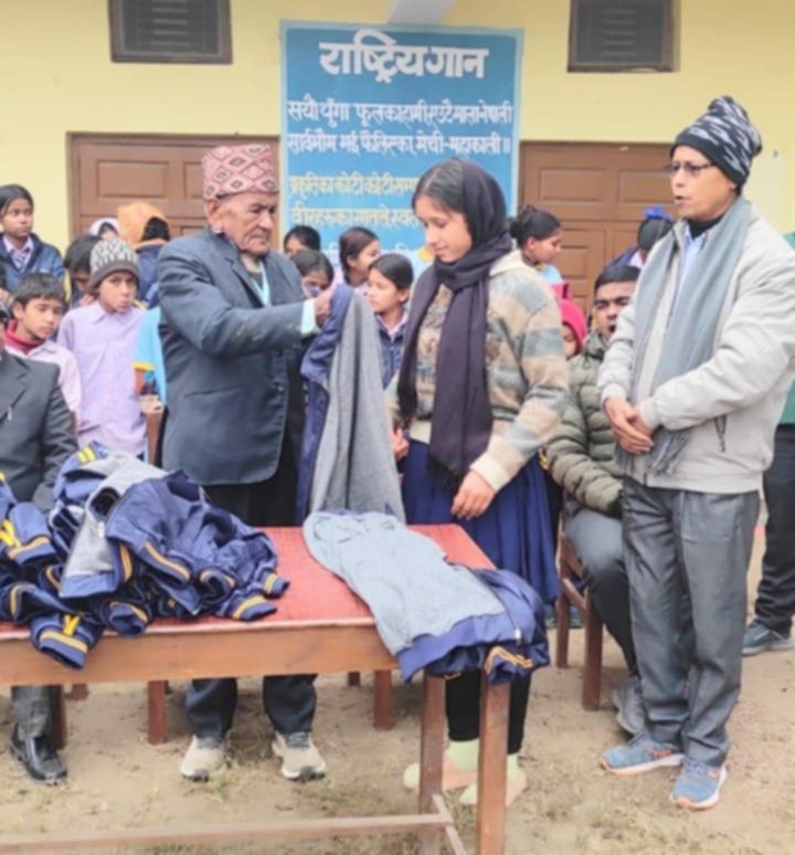 खैरिफाँटा , कैलाली । आफ्ना हजुरबुबा गगनसिंह थापा संस्थापक प्रधानाध्यापक रहनु भएको जानकी गाउँपालिका वडा न ९, खैरिफाँटा, कैलाली स्थित अरुणोदय माध्यमिक विद्यालयका ३३ जना बिपन्न परिवारका जेहेन्दार विद्यार्थीहरुलाई उहाँको स्मृतिमा नाति सुहिम थापाले विद्यालयको न्यानो पोशाक सहयोग गर्नुभएको छ । उनका जेठा हजुरबुबा श्री शेरबहादुर थापाले आज विद्यालयमा आयोजित एक बिशेष कार्यक्रममा उक्त पोशाकहरु विद्यालयको छनोट र सिफारिसमा बिपन्न परिवारका ३३ जना जेहेन्दार विद्यार्थीहरुलाई हस्तान्तरण गर्नु भएको हो ।