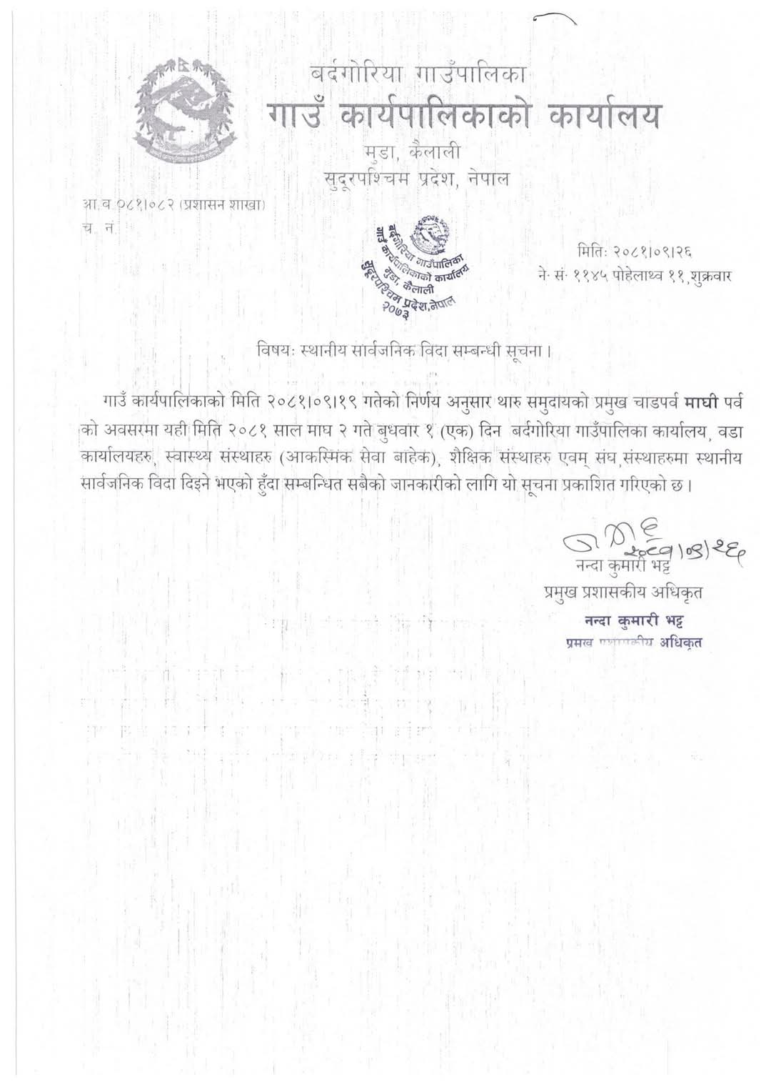 कैलाली । कैलालीको बर्दगोरिया गाउँपालिकाले माघी पर्वको अवसरमा एक दिन स्थानीय सार्वजनिक बिदा दिएको छ । गाउँपालिकाले सूचना जारी गर्दै पुस १९ गते बसेको कार्यपालिका बैठकले माघीमा एक दिन सार्वजनिक बिदा दिने निर्णय गरेको जनाएको हो ।