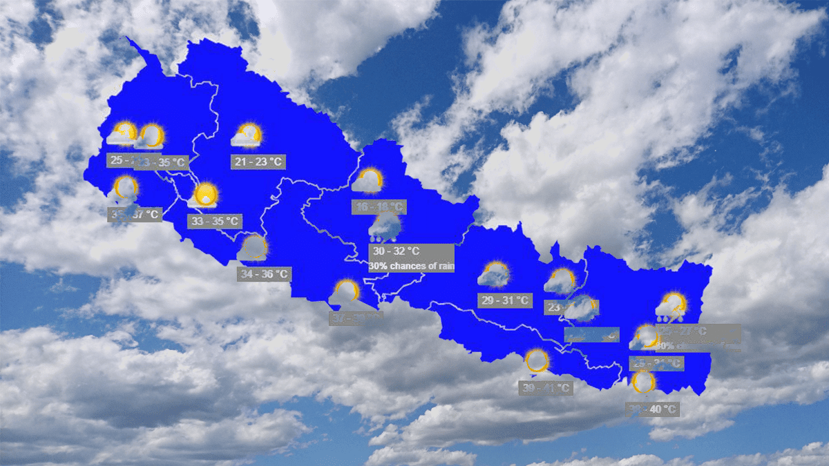 काठमाडौं। हाल देशमा पश्चिमी न्यून चापीय प्रणालीको प्रभाव रहेको छ । जल तथा मौसम विज्ञान विभाग, मौसम पूर्वानुमान महाशाखाका अनुसार देशभर आंशिक देखि साधारणतया बदली रहेको छ । दिउँसो कोशी प्रदेश, मधेश प्रदेश र बागमती प्रदेशमा आंशिक बदली रही बाँकी भू-भागमा मौसम मुख्यतया सफा रहने छ। राती भने कर्णाली प्रदेश र सुदूरपश्चिम प्रदेशमा आंशिक बदली रही बाँकी भू-भागमा मौसम मुख्यतया सफा रहने छ।