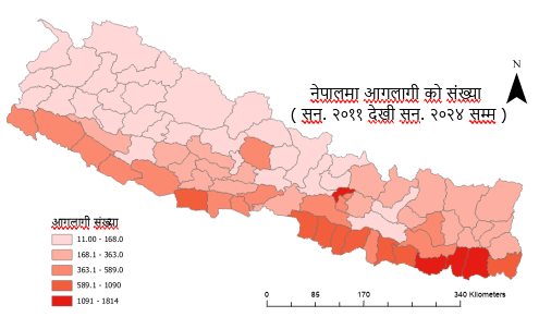 तलको नक्सामा गृह तथा मामिला मन्त्रालयले आफ्नो प्रकोप पोर्टलमा राखेको कुल २८ हजार १२४ आगलागीका घटनालाई आर्क जिआइएस प्रो विधिमार्फत् नक्सामा उतारिएको छ, जसले नेपालमा आगलागीका घटनाको  स्थानीय वितरणको ढाँचालाई देखाउँछ। माथिको नक्सामा गाढा रातो भएका जिल्लाहरूमा अधिक आगलागीका घटना घटेका छन् र कम गाढा रातो भएका जिल्ला कम आगलागीका जिल्लामा पर्दछन्। यसरी हेर्दा, तराईका सबै जसो जिल्लाहरू गाढा रंगले भरिएका छन्। फेरि पहाडी र उच्च पहाडी भेगमा भने पूर्वी भागभन्दा पश्चिम भाग कम गाढा रातो रंगले भरिएका छन्। अर्थात्, जति-जति पश्चिम दिशातिर गयो उति-उति कम आगलागीका घटना देखिन्छन्।