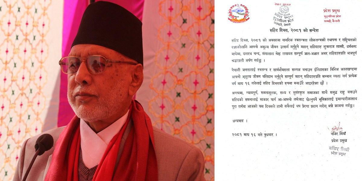 ‘न्यायपूर्ण, समतामूलक, सभ्य र सुसंस्कृत समाजका साथै समृद्ध राष्ट्र बनाउने सहिदको सपनालाई साकार पार्न आफ्नो तर्फबाट खेल्नुपर्ने भूमिकालाई इमानदारिताका साथ पूरा गर्न आजको यस दिवसले हामी सबैलाई थप प्रेरणा प्रदान गरोस् भन्ने कामना गर्दछु’ प्रदेश प्रमुखले जारी गरेको सन्देशमा उल्लेख गरिएको छ ।