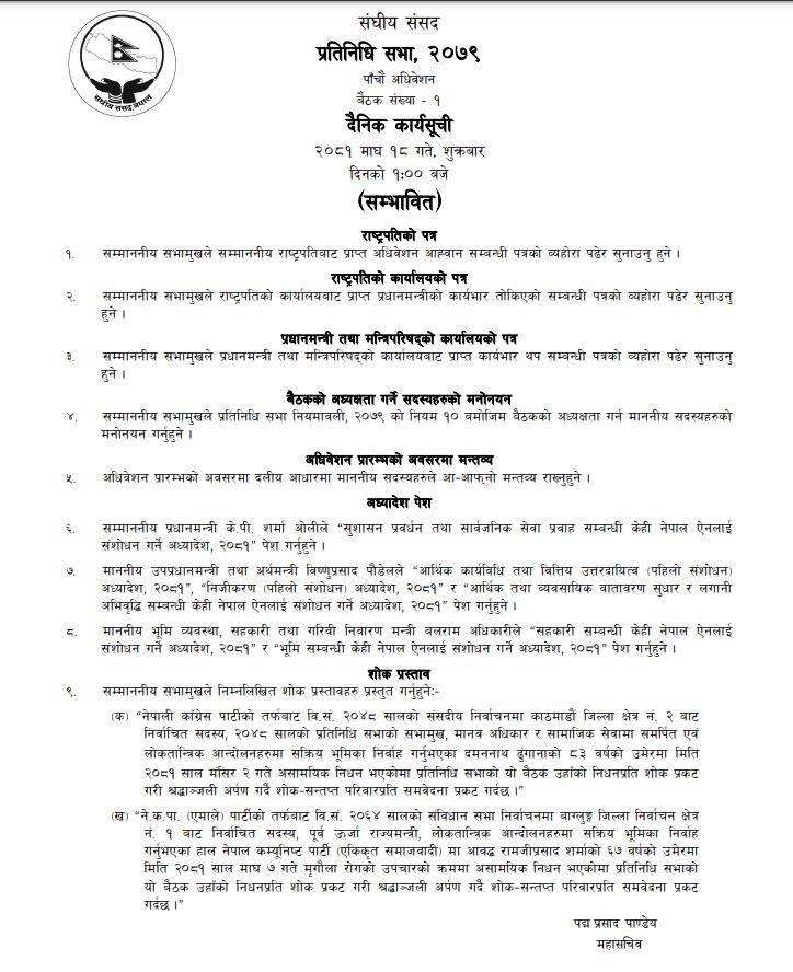 त्यसपछि आजको बैठकमा प्रतिनिधिसभा नियमावली २०७९ नियम १० बमोजिम बैठकको अध्यक्षता गर्न सांसदहरूको नामावली सार्बजनिक गर्नेछन भने बैठक आरम्भको अवसरमा दलीय मान्यता अनुसारको धारणा र मन्तब्य राख्ने क्रम सुरू हुनेछ । साथै, सुशाषन प्रबर्धन तथा सार्बजनिक सेवा प्रवाह सबन्धी केही नेपाल एेनलाइ संसोधन गर्ने अध्यादेश–२०८१ प्रधानमन्त्री केपी शर्मा ओलीले पेश गर्ने संसद सचिवालयले जनाएको छ ।