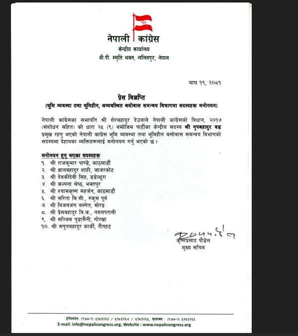 काठमाडौं । नेपाली कांग्रेसले भूमि व्यवस्था तथा भूमिहीन, अव्यवस्थित बसोबास समन्वय विभागमा सदस्यहरू मनोनयन गरेको छ । नेपाली कांग्रेसका सभापति श्री शेरबहादुर देउवाले नेपाली कांग्रेसको विधान, २०१७ (संशोधन सहित) को धारा २५ (९) बमोजिम पार्टीका केन्द्रीय सदस्य श्री नृपबहादुर वड प्रमुख रहेको भूमि व्यवस्था तथा भूमिहीन बसोबास समन्वय विभागको सदस्यमा १० जनालाई मनोनयन गरेका हुन । जसअनुसार, श्री राजकुमार पाण्डे, काठमाडौं,  ज्ञानबहादुर शाही, जाजरकोट, देवकीदेवी सिंह, डडेल्धुरा, श्री कल्पना श्रेष्ठ, भक्तपुर, श्यामकृष्ण महर्जन, काठमाडौं, सरिता बिसी, रुकुम पूर्व, विजयजंग बस्नेत, मोरङ, प्रेमबहादुर विक, नवलपरासी, सञ्जिव पुडासैनी, गोरखा, सपुतबहादुर कार्की, रौतहट रहेको केन्द्रिय कार्यालयका मुख्य सचिव  कृष्णप्रसाद पौडेलले जानकारी दिए ।