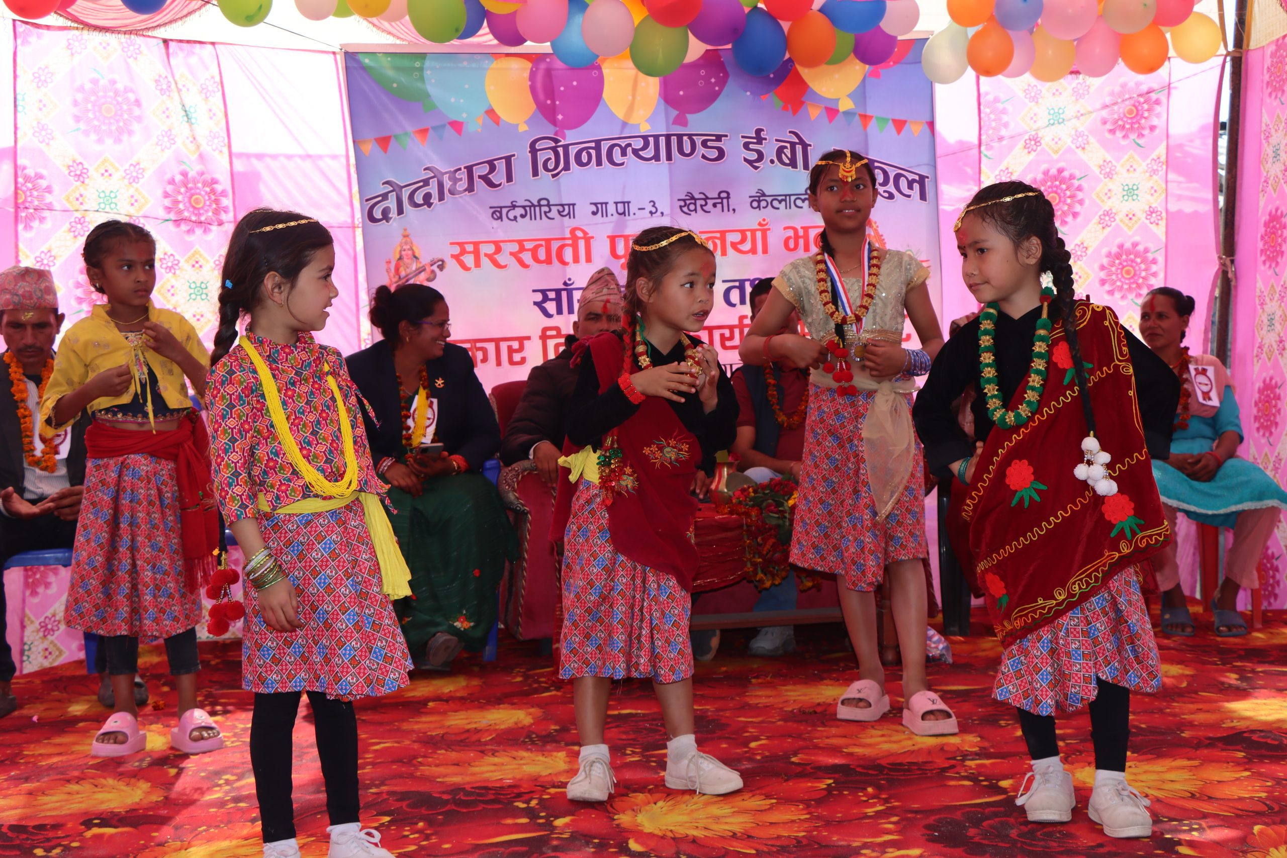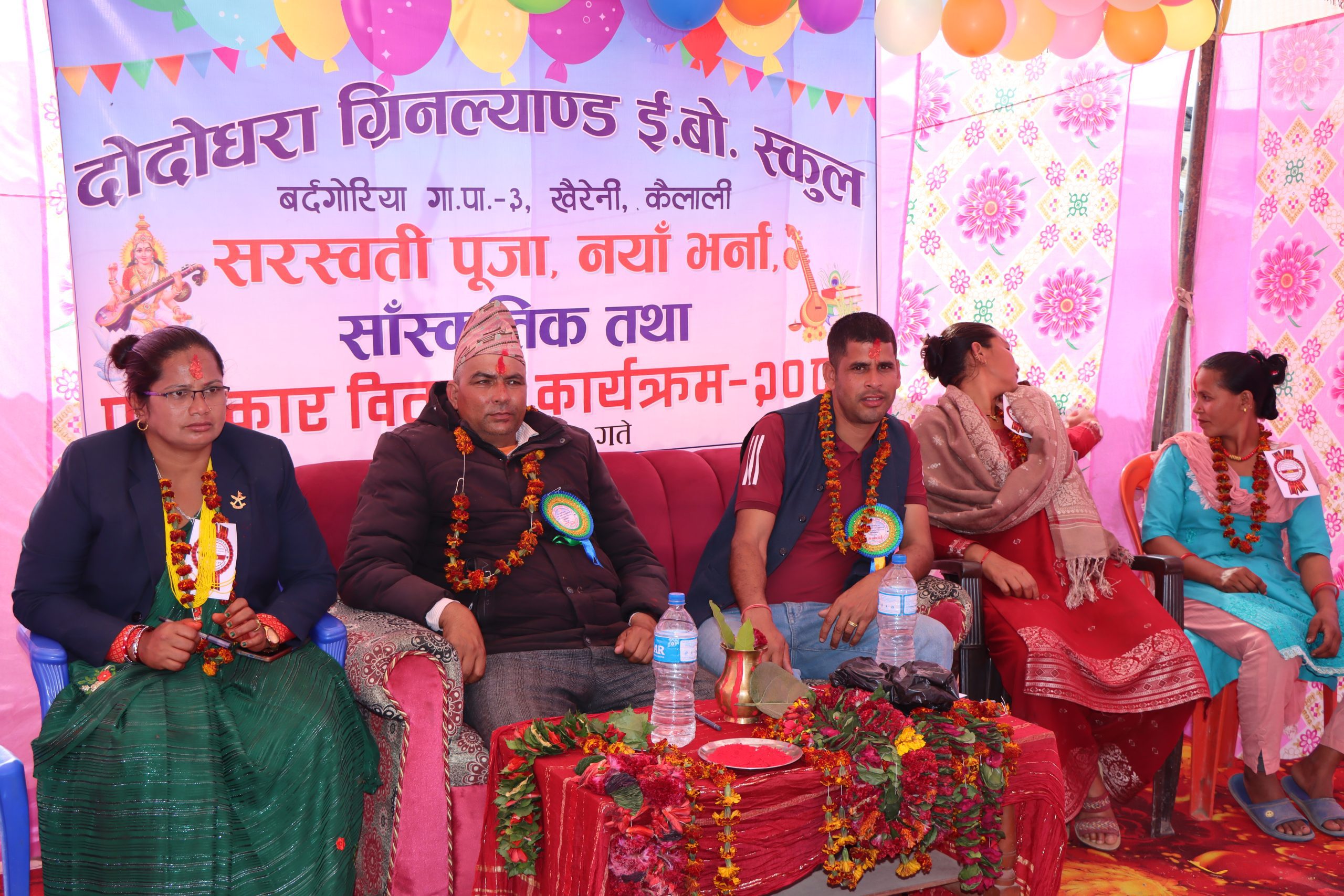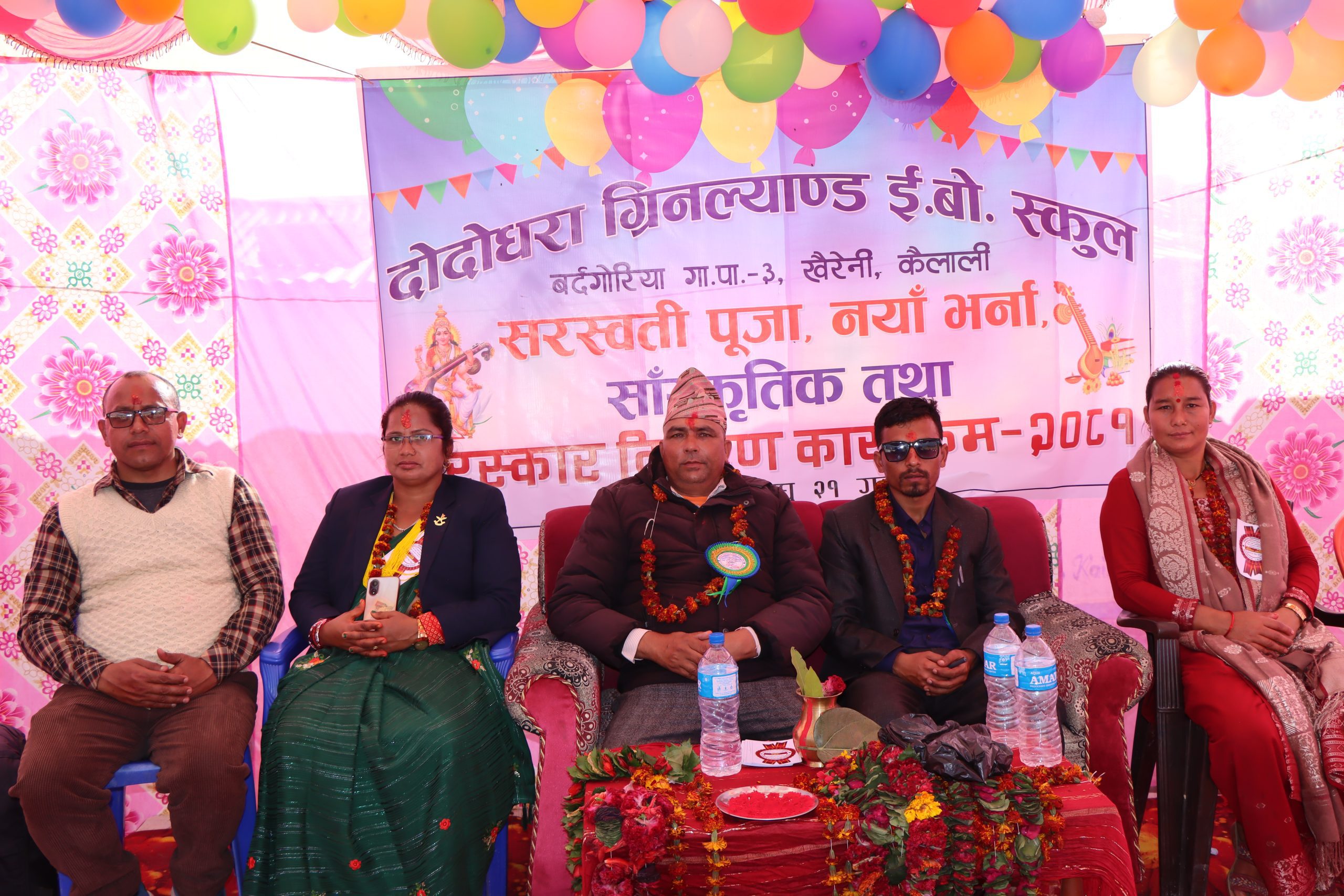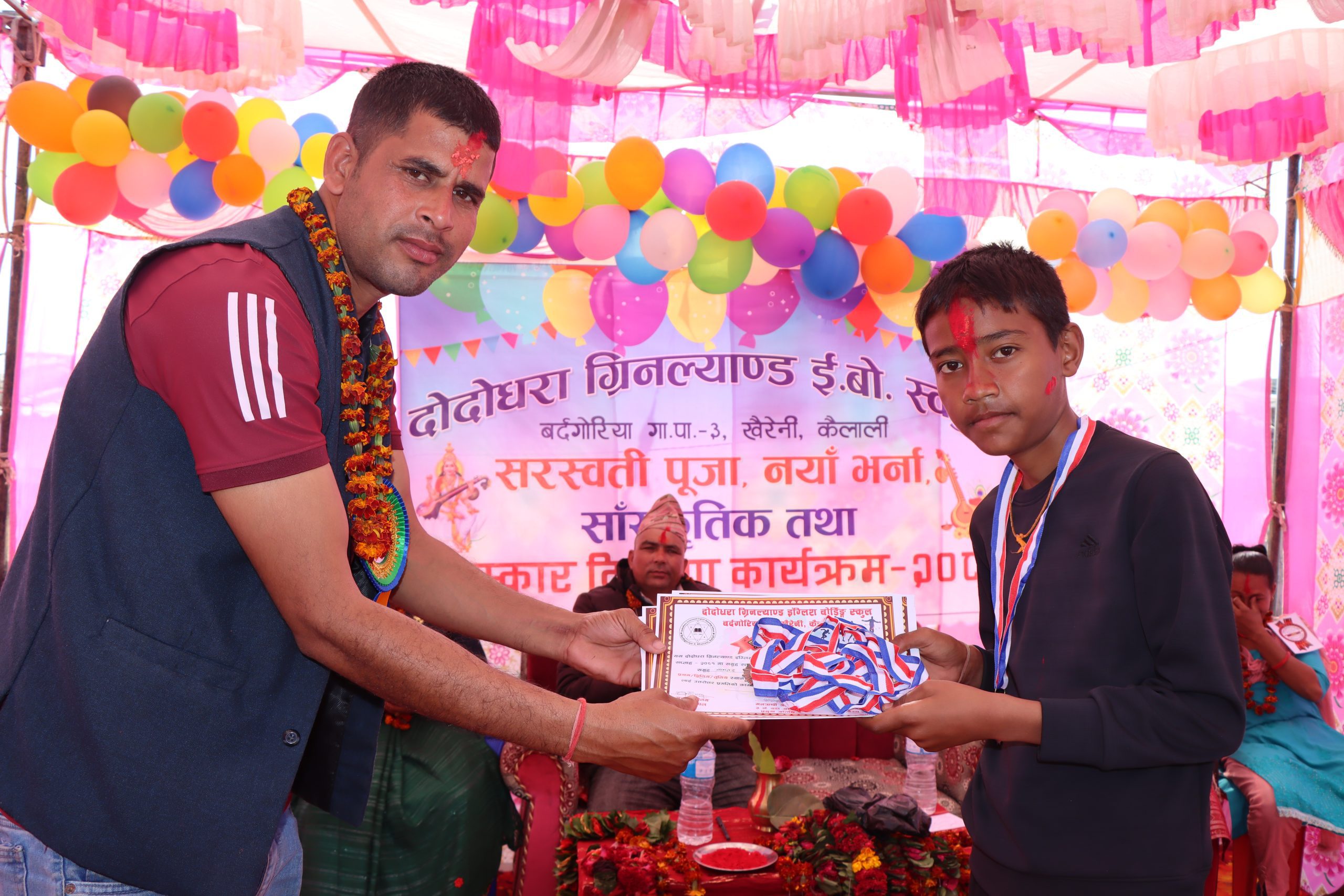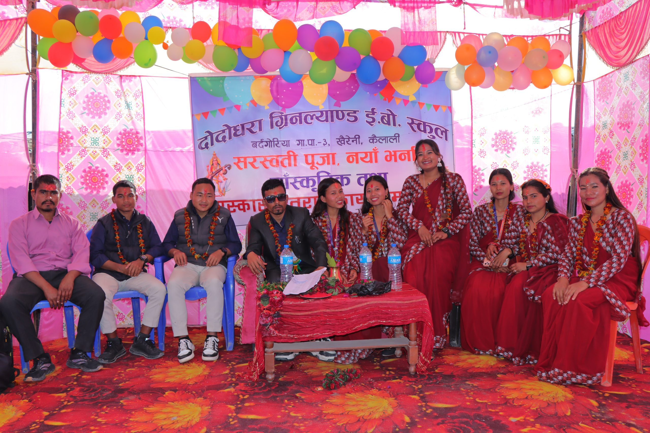 कैलाली । कैलालीको बर्दगोरिया गाउँपालिका वडा नं ३ खैरेनी स्थित दोदोधरा ग्रिनल्याण्ड इंग्लिश बोर्डिङ्ग स्कूलमा सोमबार सरस्वती पूजा , नयाँ भर्ना सांस्कृतिक कार्यक्रम सहित पुरस्कार वितरण समारोह सम्पन्न भएको छ ।